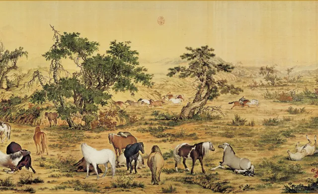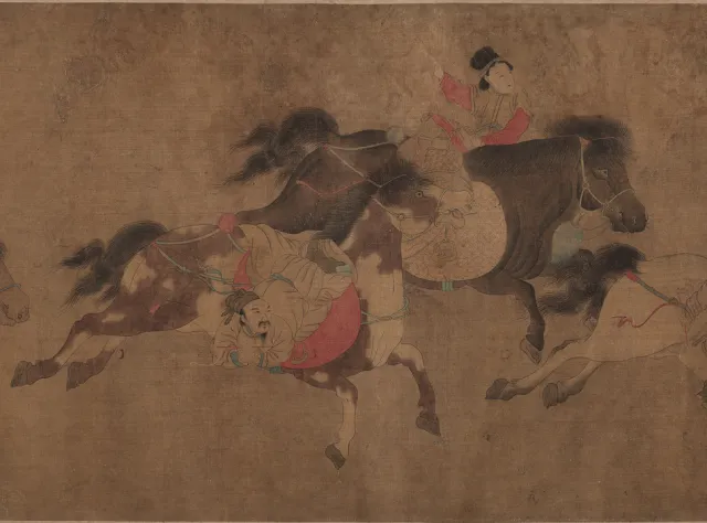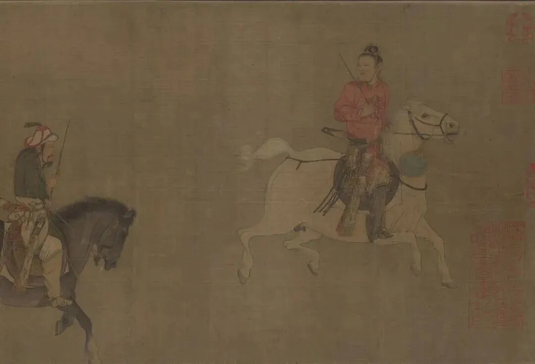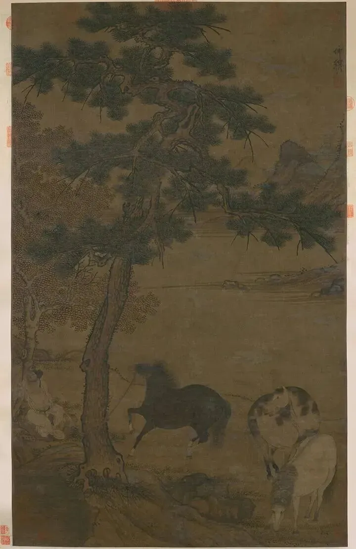 描绘春日骑马游玩的惬意场景。画中虽有马球游戏,但整体氛围更侧重于“游春”的享受而非激烈的竞技。在这里,马匹卸下了战甲与重负,完全融入春日和煦的光景之中,其生命的美好以最为舒展、愉悦的形式得以绽放。