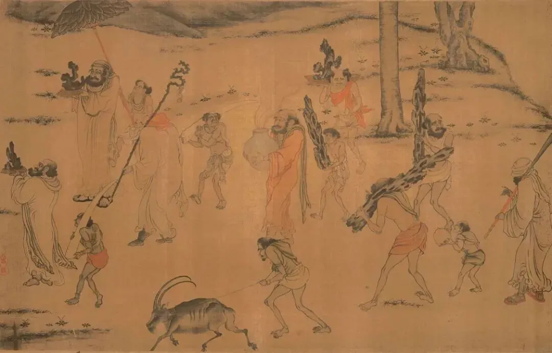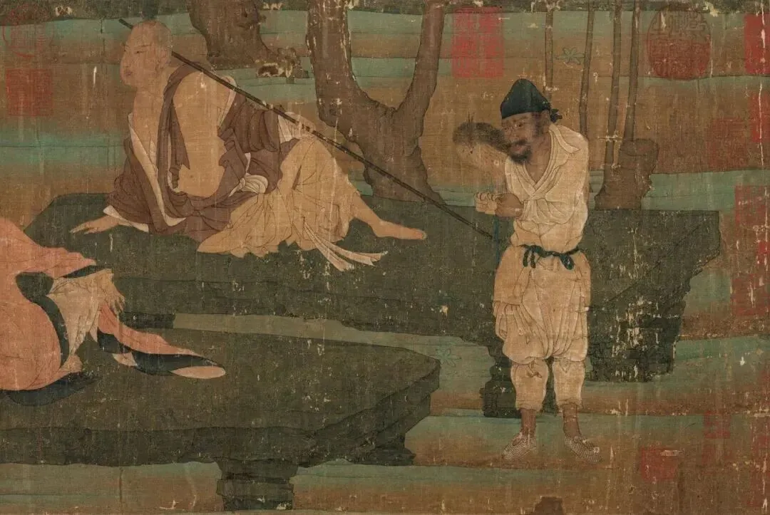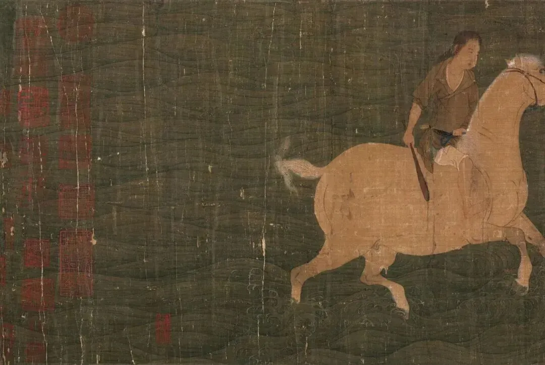 支遁爱马,非重其筋骨,实慕其神采;马在此也非役驾之战骑,而是脱缰踏浪、超凡自在的精神化身。画面通过僧、士、马三者之间的凝视与奔涌,传递出唐人对于“神骏”意象的理解——那是一种融合了禅意、诗情与人格理想的精神写照。