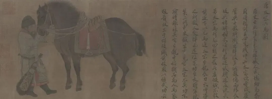 此卷表现了对历史英雄与战马精神的追摹。其中“飒露紫”一段,描绘邙山之战种,大将丘行恭为马拔箭的场景,展现了战争中人与马之间超越功利的深情厚谊。马在此,是历史的见证者,也是情感的承载者。