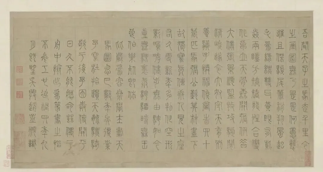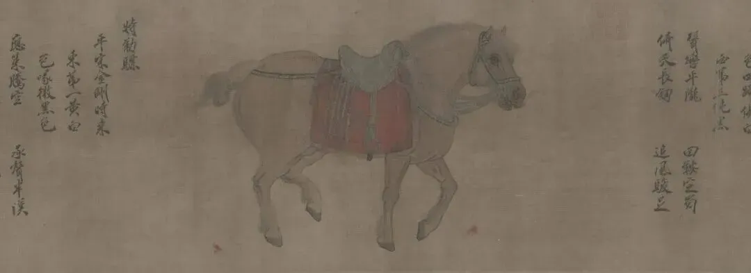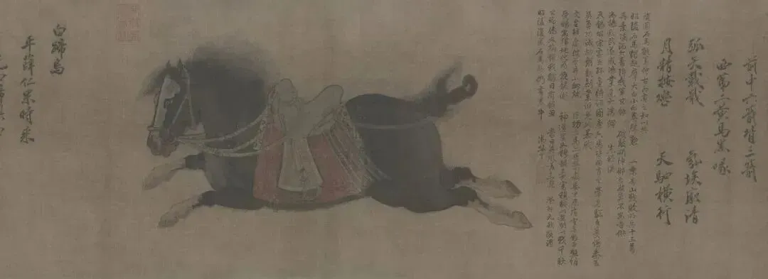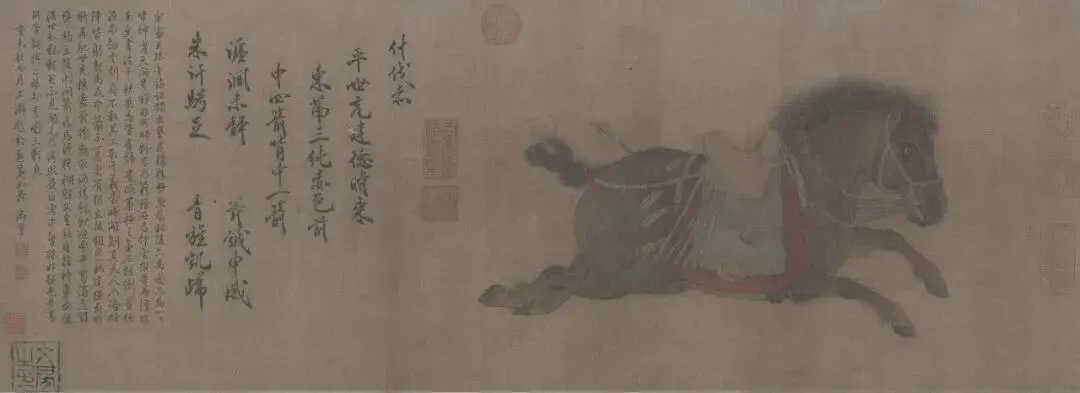 卷后附杜甫《天育骠骑歌》篆书。天马在传统文化中常象征超凡的英才,与其自由奔放的精神境界,杜甫原诗以天马喻人,讽刺唐天宝年间人才不被重用的社会现实。此卷将诗、书、画结合,表达了文人对于理想人格与精神自由的向往,也反映了文人画创作题材的“复古”思潮,寄托了对历史上最强盛的时代的追慕。使马的形象从形似走向神似,成为心灵世界的坐骑。