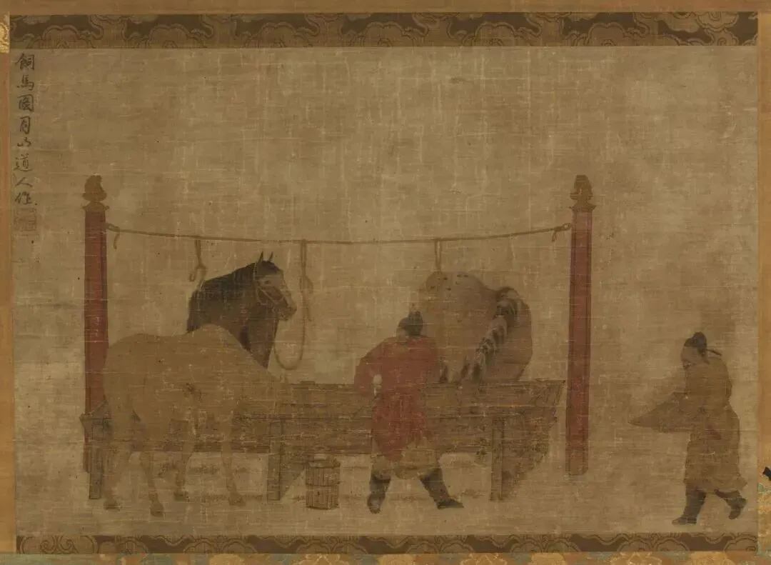 洗马不仅是养护,更是一种仪式化的亲近。在这幅长卷中,马与人共同构成一幅和谐的生动画卷,流露出士人阶层对田园牧歌生活的向往,以及马在其中所扮演的闲适陪伴角色。