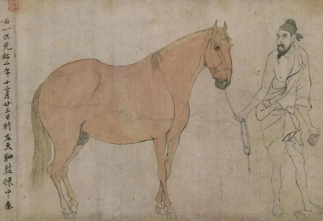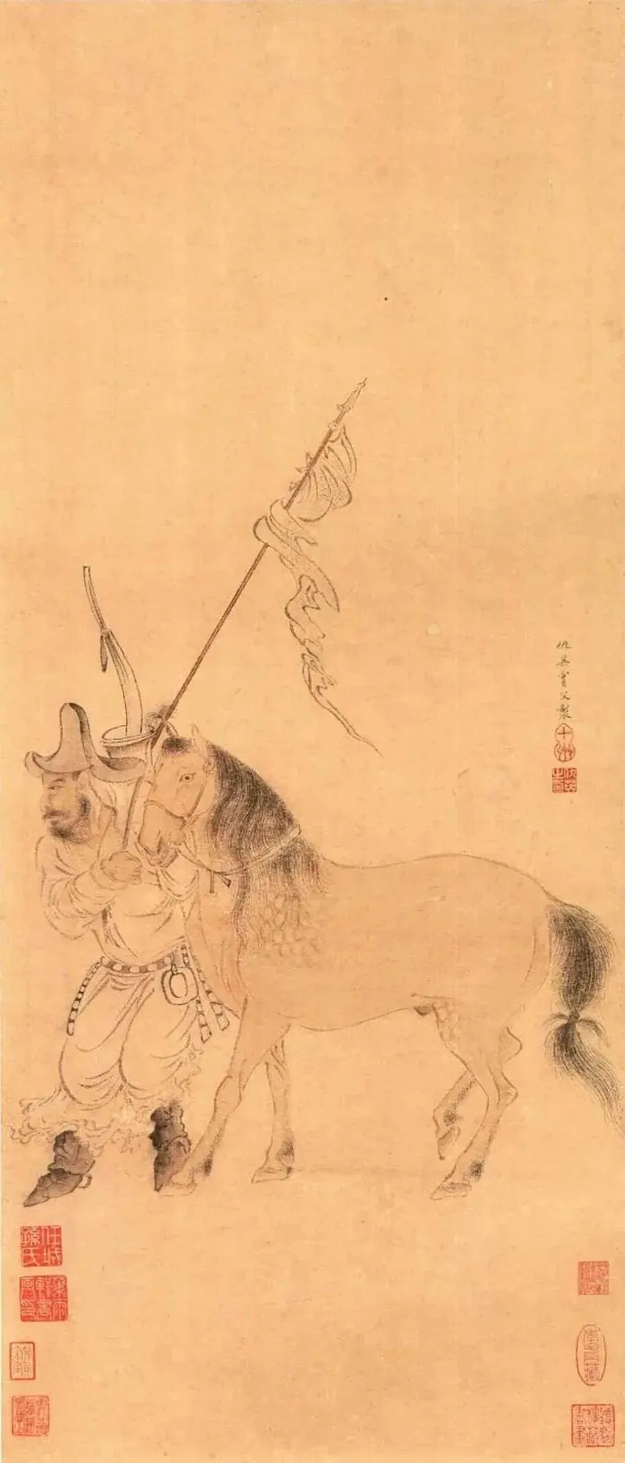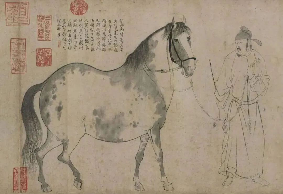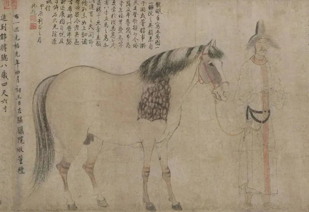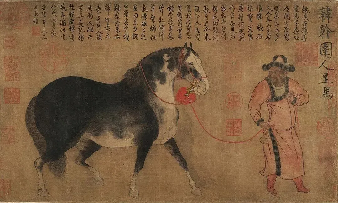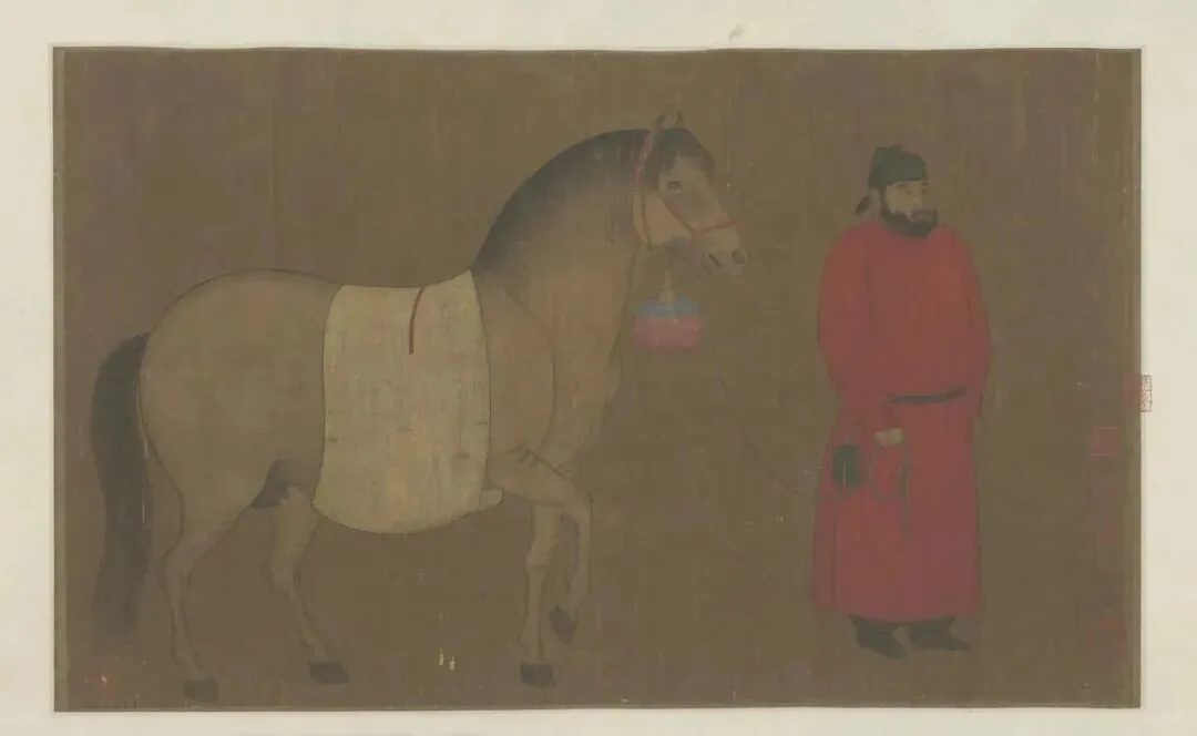 唐代重视马政,良马的培育与进献是国家大事。这幅图以艺术手法记录了这一仪式瞬间,展现了人与马在制度与情感层面的双重联结。马不仅是圉人的财产,更是荣耀与责任的象征,在战时驰骋疆场,和平年代则静静守望着国家的秩序与尊严。