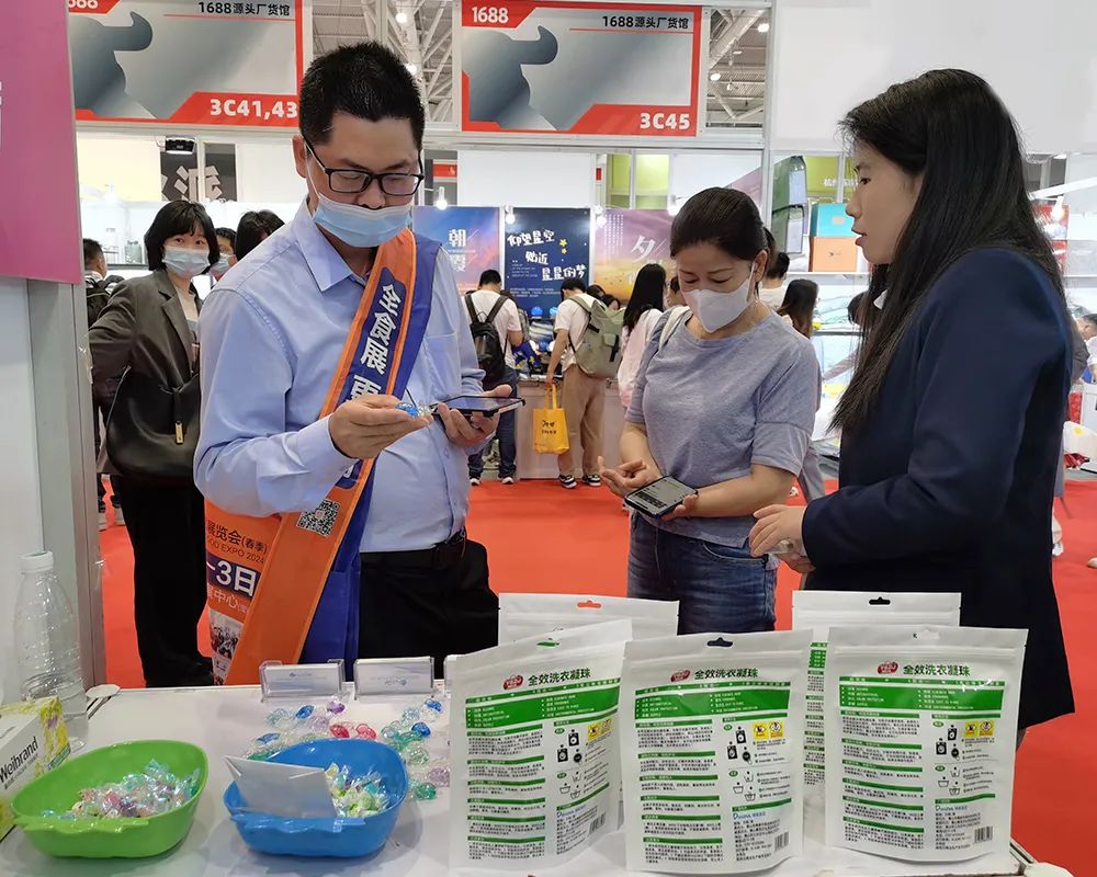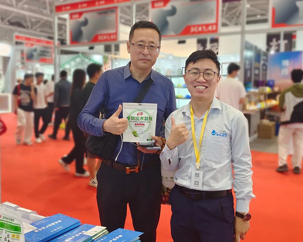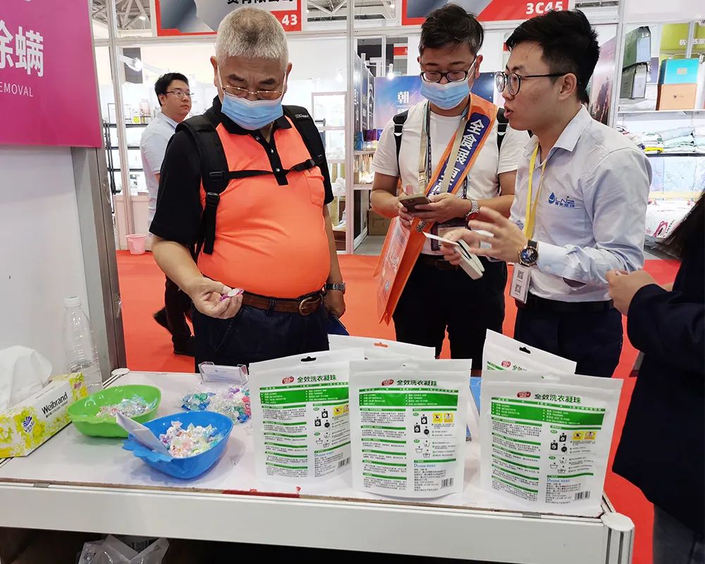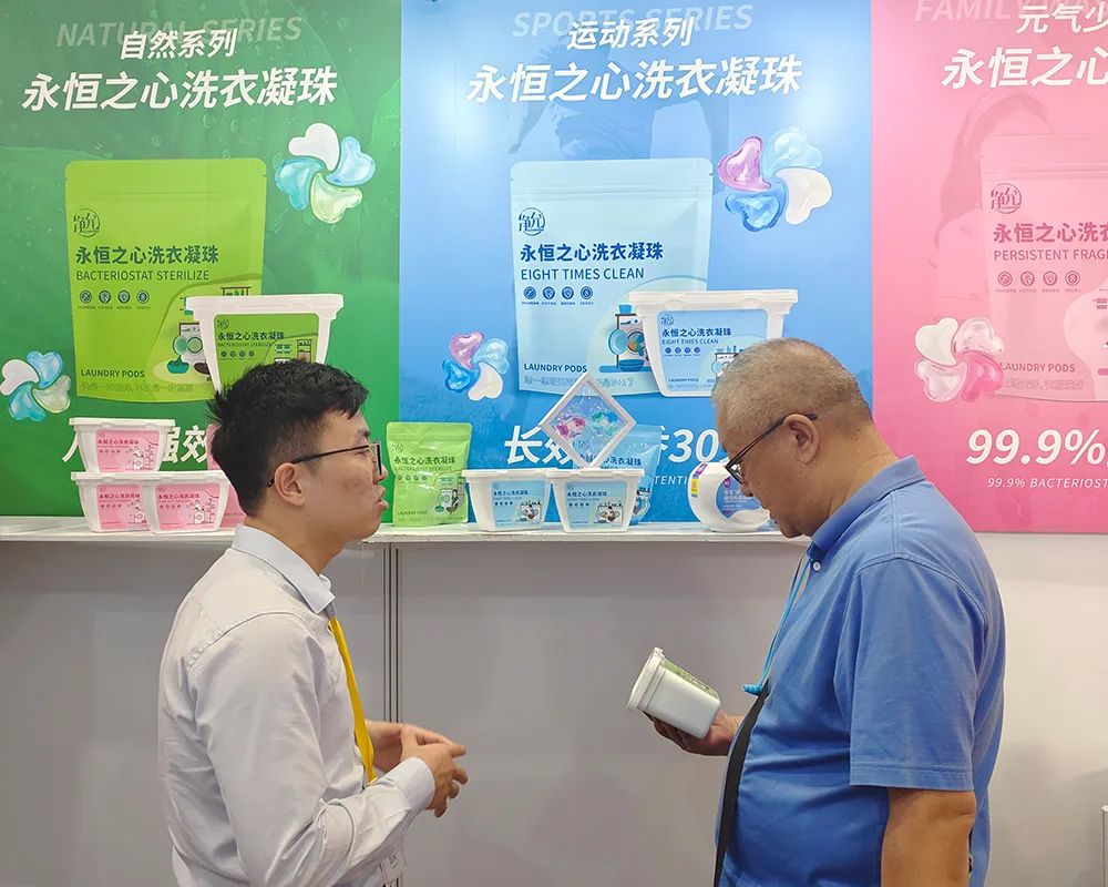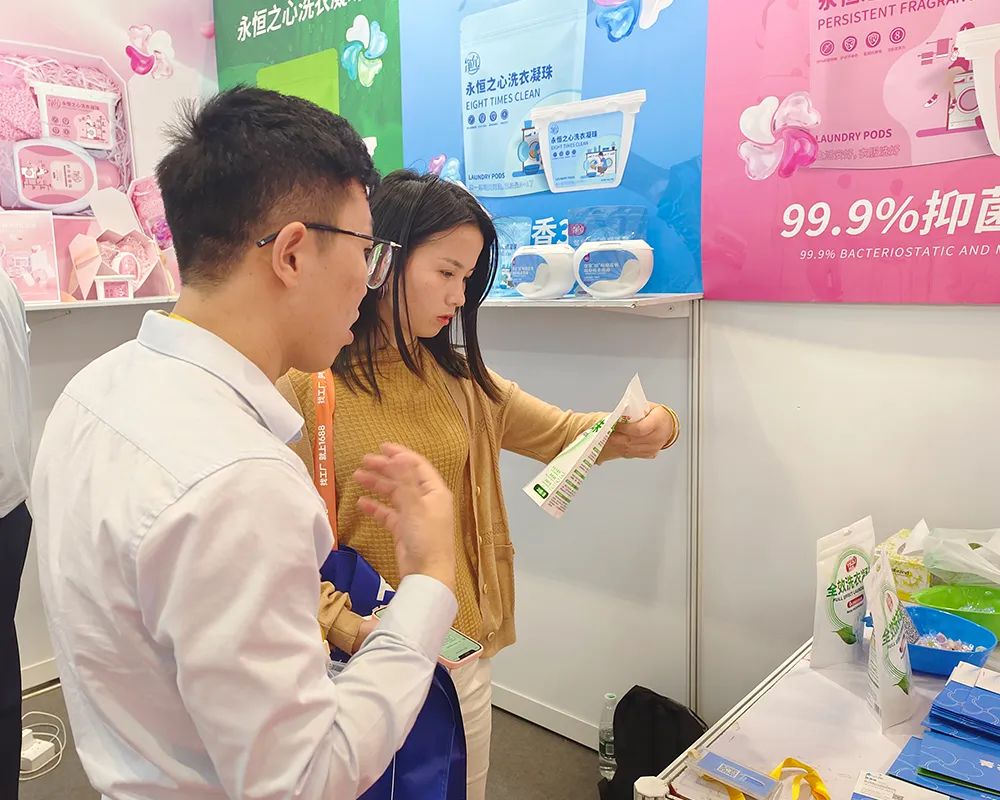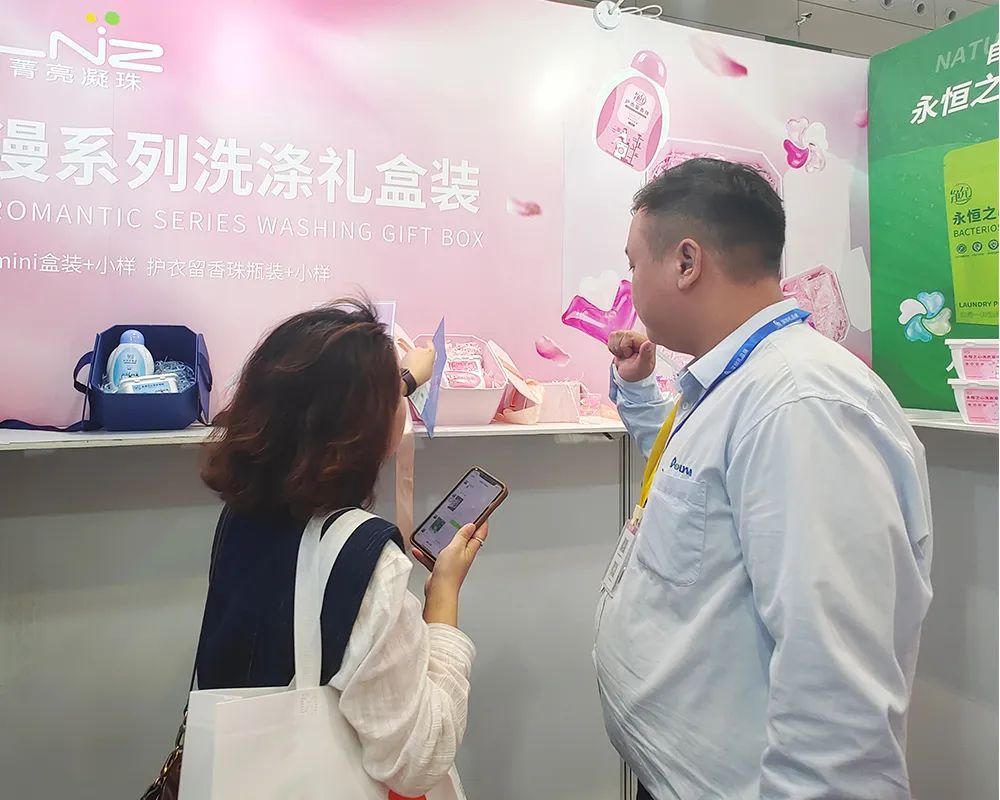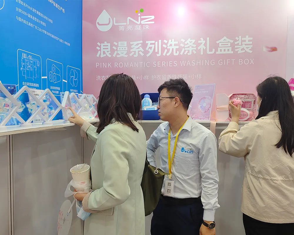 此外,展会首日,菁亮展厅比肩继踵、人气爆棚,菁亮日化凭借突破性的全新创新型洗衣凝珠、热情的服务态度吸引了众多客户参观交流。业务团队为前来咨询的客户详细介绍凝珠产品的特点及应用领域,并根据不同的香型、规格、功效和配方等,推荐相应的产品以及解决方案,让每一位客户体验到菁亮的专业技术和优质服务,团队秉承“客户至上”的服务理念,为客户提供全方位、高效、贴心的服务。