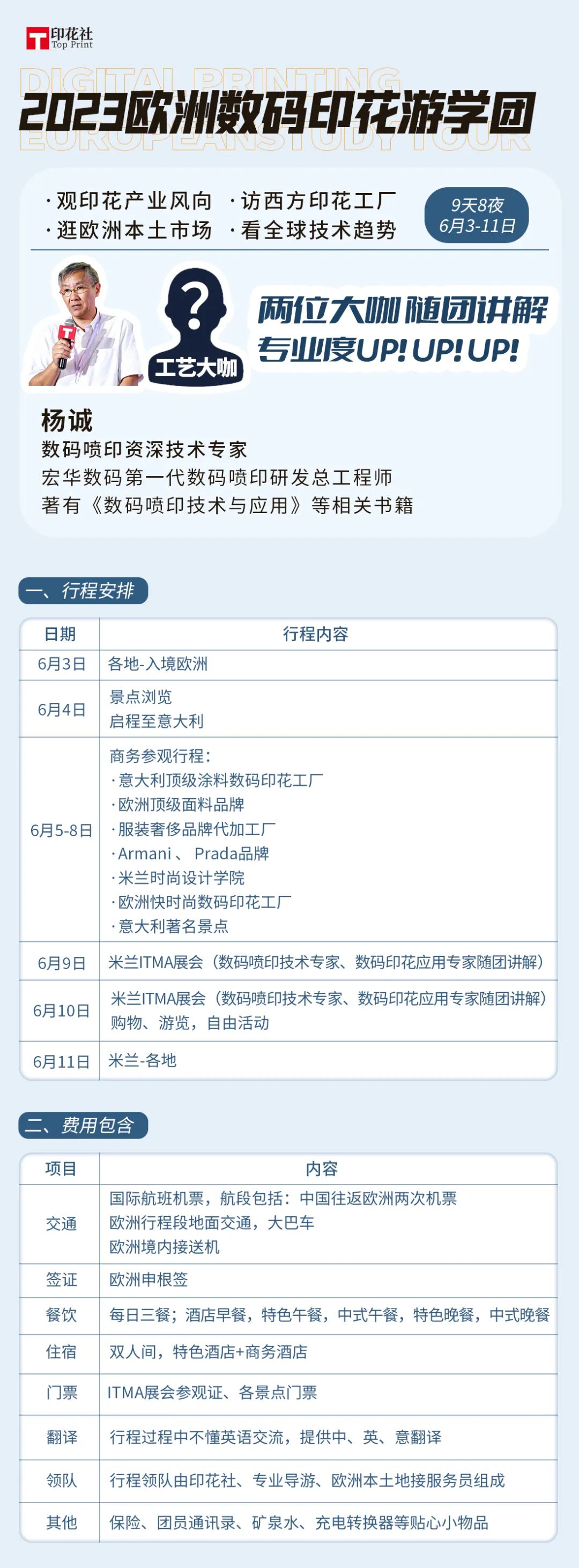 国际往返机票、签证、食宿、欧洲接机、地面交通(大巴)、中文翻译、ITMA及全球数码印花论坛门票、景点门票等。