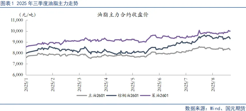 2025年三季度,国内豆油、棕榈油和菜油期货市场整体呈现价格中枢连续上抬后高位震荡走势,随着9月利空因素开始发酵,呈现高位见顶态势。