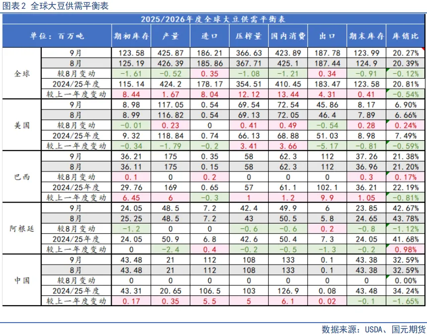 根据USDA9月供需报告显示,2025/26年度全球大豆供应总体小幅收紧。全球产量预估为4.2587亿吨,较8月预估下调了50万吨。同时,全球大豆期末库存预估为1.2399亿吨,较8月预估下调了90万吨。这表明全球大豆供应虽然依然充足,但比此前预期的略微紧张一些。