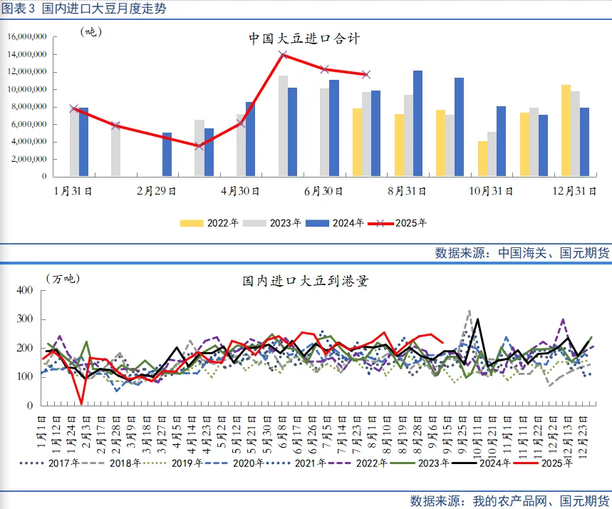 2025年三季度以来,中国大豆进口量维持高位,8月单月进口1227.9万吨,1-8月累计达7331.2万吨,同比增长4%,但进口金额同比下降9.3%。进口来源呈现高度集中化特点,中国几乎完全依赖南美供应,已预订约740万吨10月装船的南美大豆,占预期需求的95%;而受加征25%关税影响,美豆价格优势尽失,同期对美采购量罕见降至零。未来四季度进口趋势将主要取决于中美贸易谈判进展,若关税壁垒持续,南美主导格局将进一步加强。