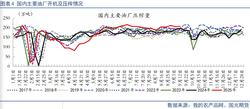 2025年三季度国内主要油厂开机率及压榨量维持同期高位,高压榨主要得益于充足的进口大豆供应,同时,虽然豆粕产出增加,但由于生猪去产能进度相对一般,整体饲料下游需求尚可,累库速度并不快。不过对于后市,尽管双节备货需求对豆粕消费形成一定支撑,但高压榨仍导致豆粕库存持续积累。短期来看,充足的原料供给将继续支撑油厂高开机率,但需密切关注下游豆粕提货及库存变化对压榨节奏的潜在影响。根据Mysteel农产品对全国主要油厂的调查情况显示,三季度国内主要油厂开机率基本维持55%以上高位,周均压榨在220万吨以上。