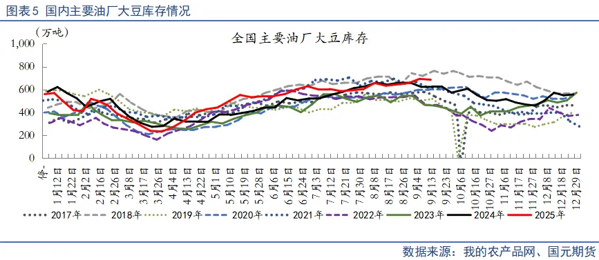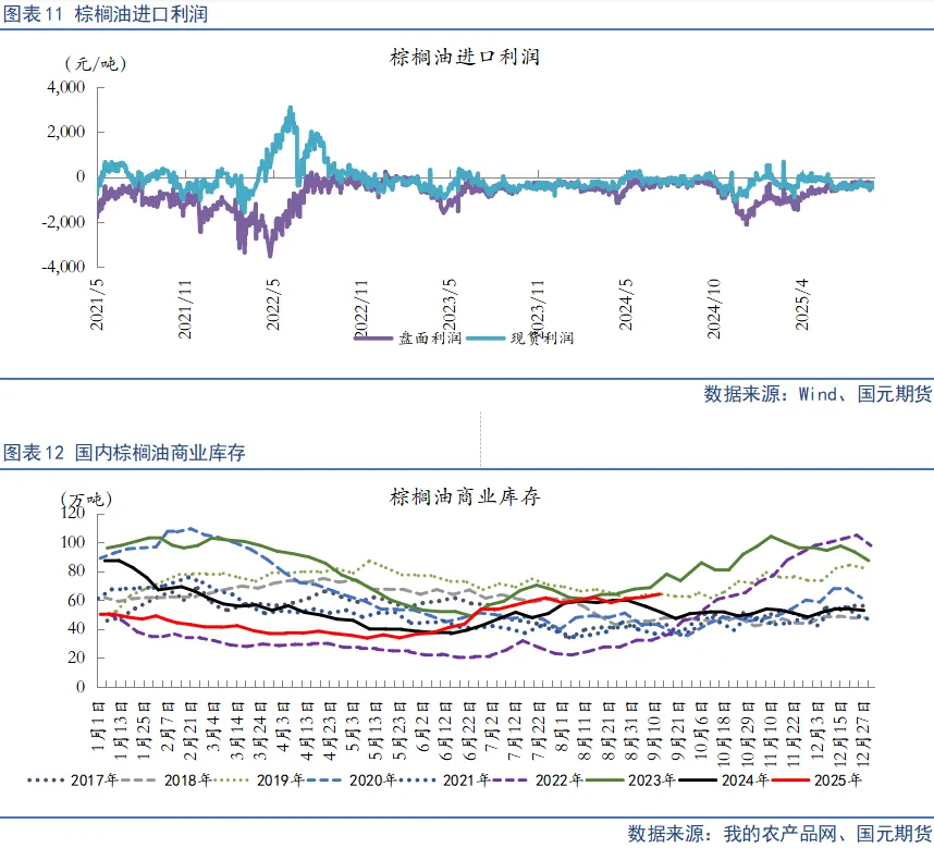 棕榈油表现相对强势,主因产地供需结构偏紧:马来西亚棕榈油虽处增产周期(前8个月累计产量近19年同期第4高),但受树龄老化制约未达巅峰水平,印尼内销旺盛及出口强劲使其库存持续低位,印度补库需求紧迫推动6-8月连续进口抬高棕榈油进口量,国内棕榈油维持进口利润低位,但三季度到港有所反弹,国内库存维持震荡。