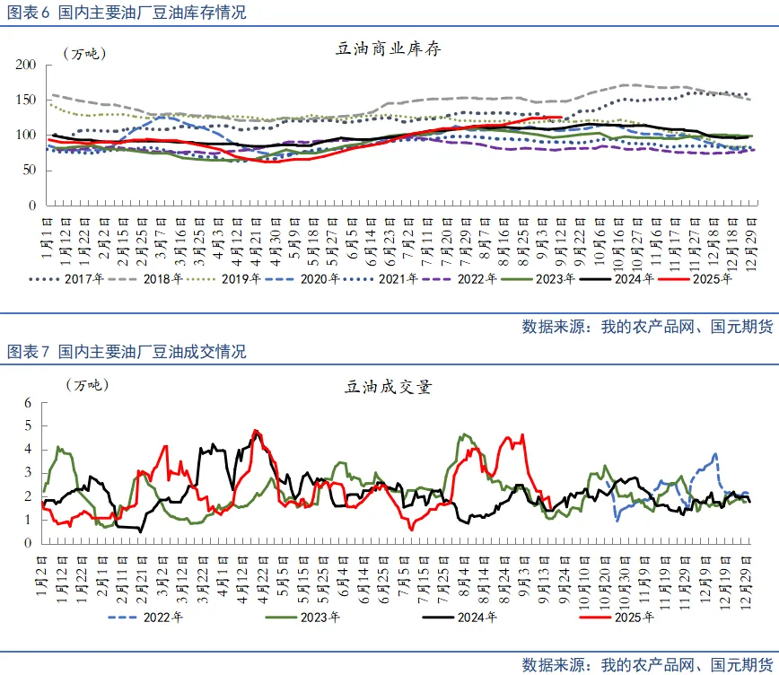 豆油期货先抑后扬,初期受中美贸易关系阶段性缓和及国内大豆到港量充裕压制,库存延续积累态势,后期随着中美第三轮谈判达成共识将关税休战延长90天,以及美国生物柴油政策可能限制使用北美以外原料生产的生柴申请税收抵免的预期,获得支撑性反弹,但随着中美贸易谈判缓和预期升温,国内进口大豆供应忧虑有所放缓。国内油脂总体供需呈“供大于求但品种分化”态势:豆油因大豆到港充裕及压榨开机率高而持续累库。