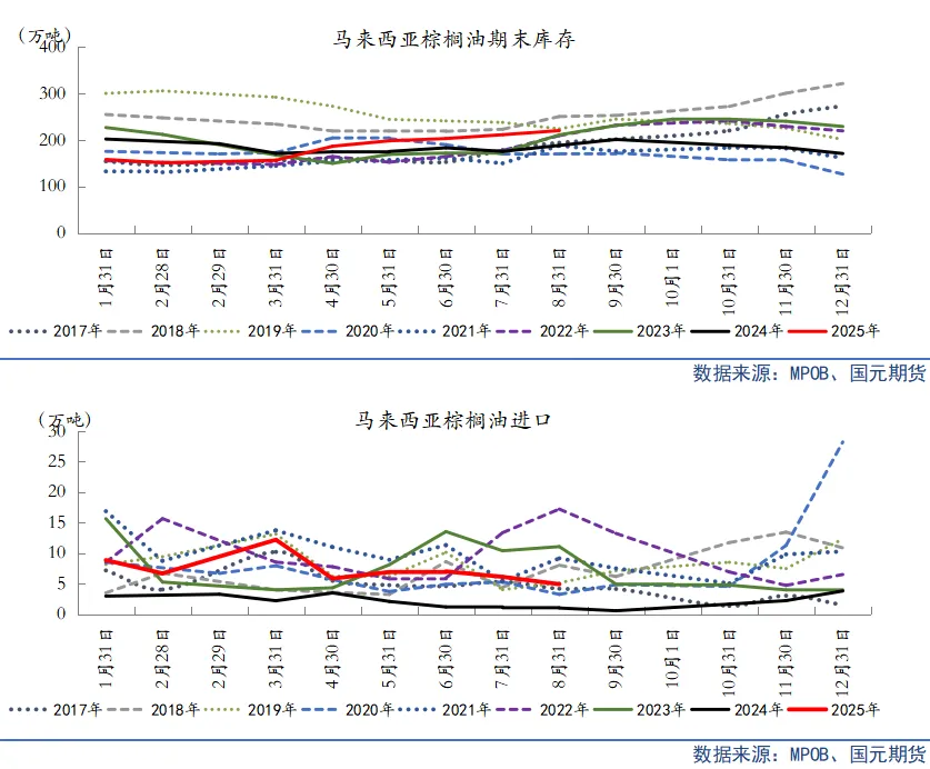 根据2025年MPOB8月报告及相关高频数据,三季度以来马来西亚棕榈油供需呈现“供增需弱,库存累积但存疑点”的特点。8月产量185.5万吨,环比增2.35%,为2023年以来同期次高值,但1–8月累计产量仅1263万吨,同比微增0.16%,增幅明显低于历史均值。国内消费49.1万吨,环比再增6.2%,连续第三个月刷新近三年峰值;增量部分并非传统食品或生柴内需,而是棕榈油及其衍生物(POME、UCO)被高价转口至欧盟做航空生物燃料,导致“表观消费”失真性抬升。出口132.5万吨,环比微降0.3%,低于机构预期的145万吨;1–8月累计出口959万吨,同比下降10.5%。印尼9月上调出口关税前抢运,挤占马棕份额,是出口疲软的主因。8月末库存220.3万吨,环比增4.2%、同比增17%,为2023年12月以来最高。虽然消费高位抵消部分出口缺口,但在季节性增产周期内,库存延续累积,供需整体宽松。