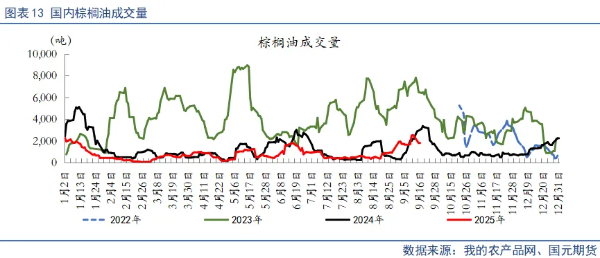 根据高频数据显示,9月以来马棕呈现产量收窄需求相对强劲格局。9月1-15日主要船运调查机构ITS和AmSpec Agri分别统计出口装船量为74.26万吨和69.57万吨,环比8月同期小幅增长2.55%,显示中旬以后出口节奏有所加快;而产量方面,SPPOMA数据显示9月1-10日马来西亚棕榈油产量环比减少约3%,单产下降2.7%,表明进入季节性减产阶段。