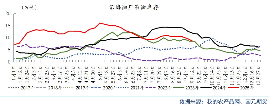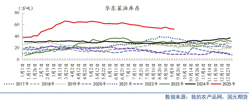 据Mysteel调研显示,截止到2025年09月12日,沿海地区主要油厂菜籽库存为7.4万吨,较上周减少2.7万吨;沿海地区主要油厂菜油库存8.65万吨,较上周下跌1.05万吨;华东地区菜油库存52.12万吨,较上周下跌1.08万吨;全国主要地区菜油库存总计60.77万吨,较上周下跌2.13万吨。