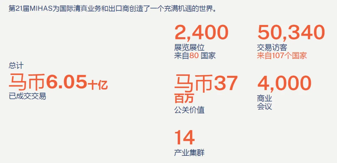 2024 年 MIHAS 吸引约43,353 名专业采购商、来自66 个国家的 2,028 个展位,为展商创造43.0 亿马币商机(数据来源:马来西亚对外贸易发展局 MATRADE)。