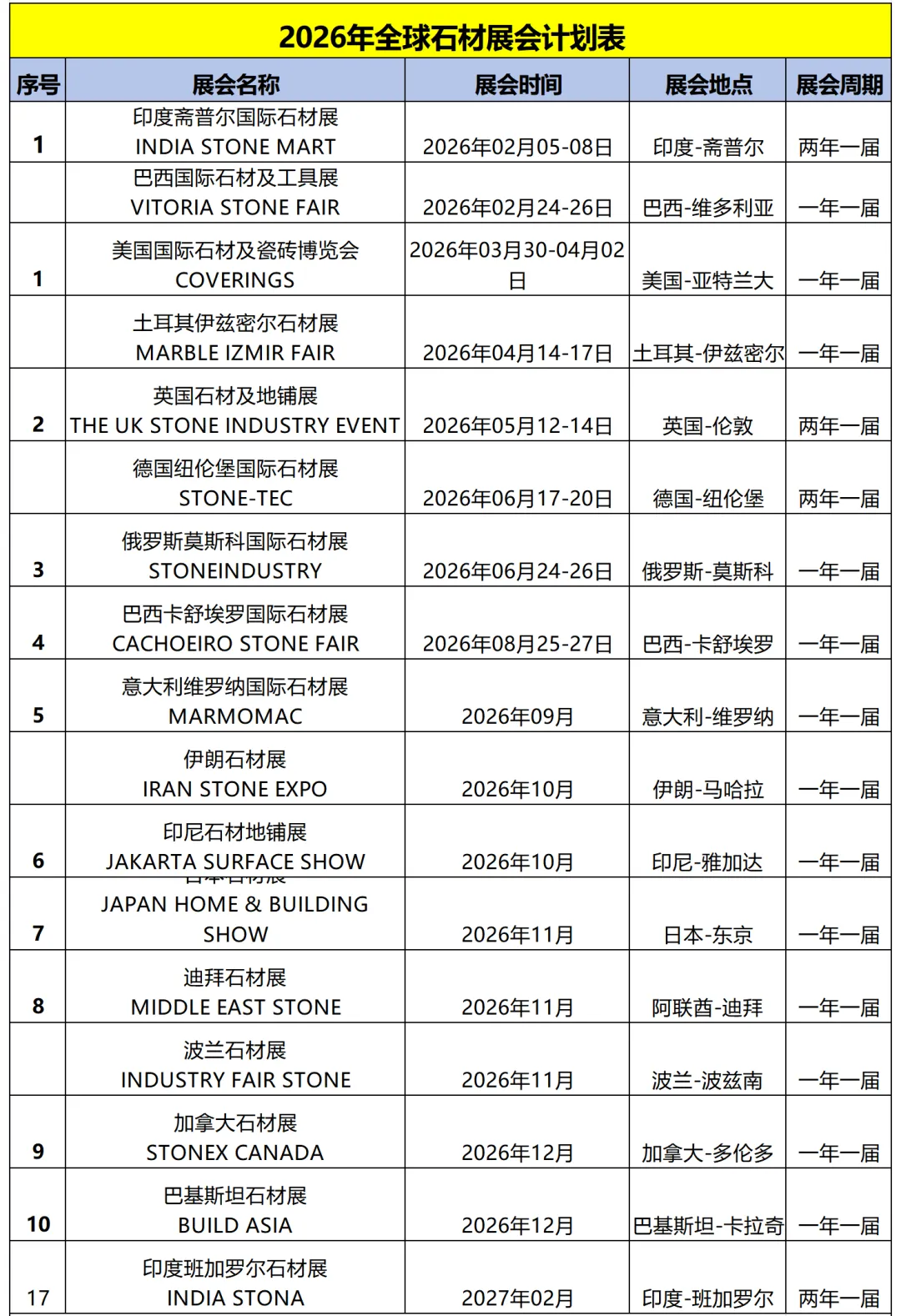 2026年全球石材展会计划表