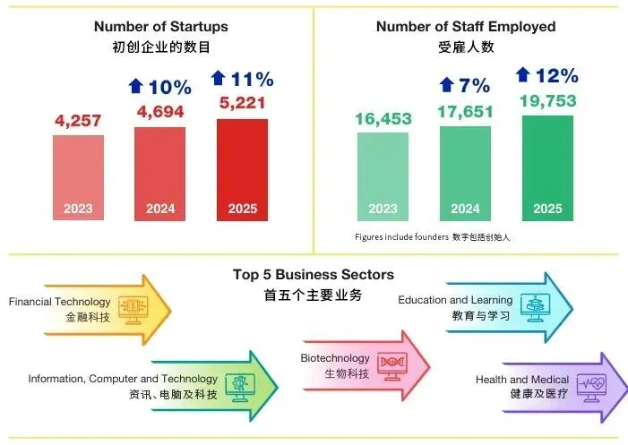 香港的初创企业持续蓬勃发展,去年的数目按年增加11%至5,221间,共雇用19,753人,按年增加12%。