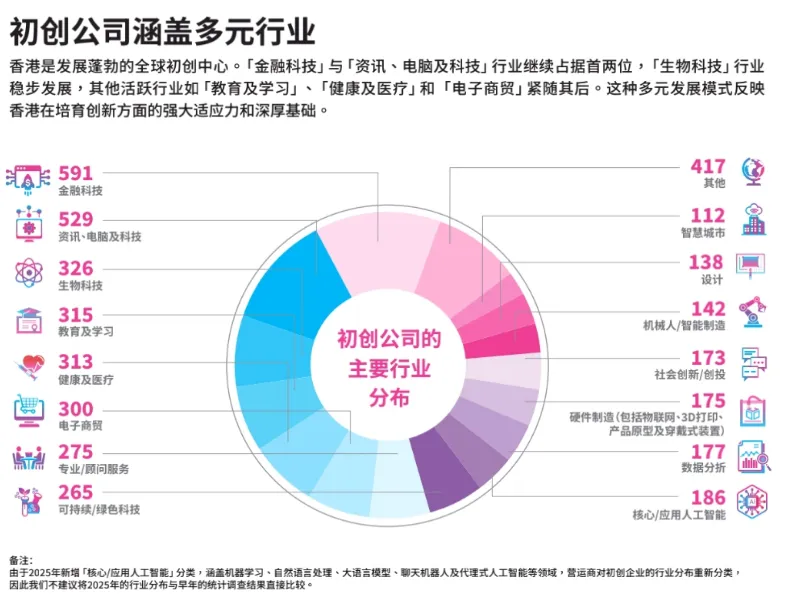 初创公司大部分都来自这些行业,其中「金融科技」与「资讯、电脑及科技」行业继续占据首两位,「生物科技」行业稳步发展,其他活跃行业如「教育及学习」、「健康及医疗」和「电子商贸」紧随其后。