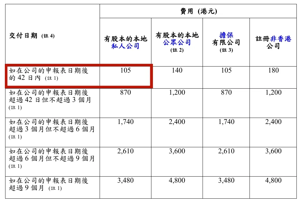 周年申报表:每年成立周年日起 42 天内提交,逾期最高罚款 3480 港币。