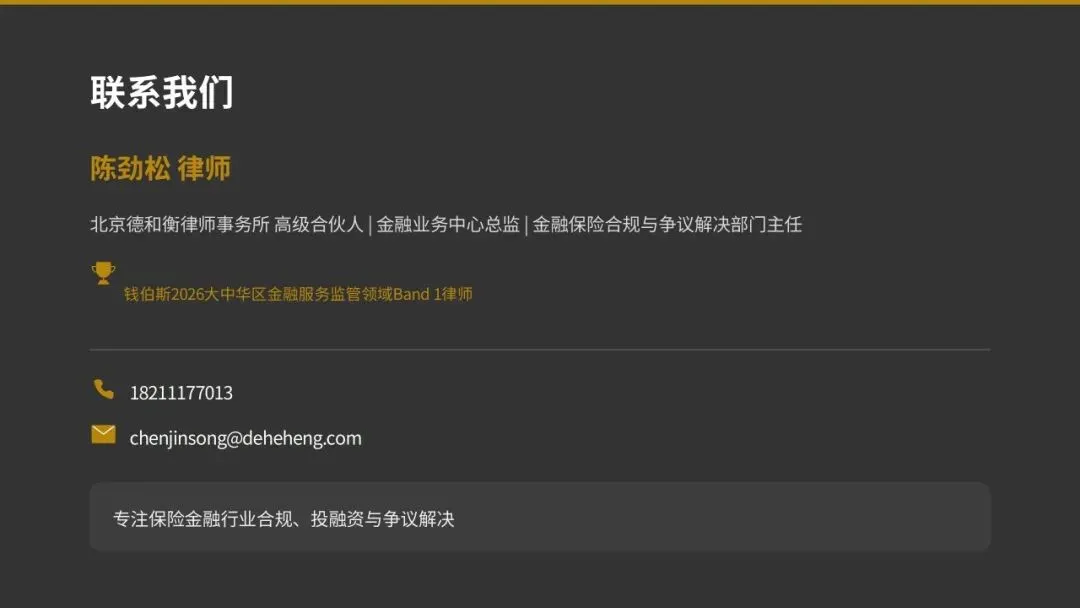 陈劲松律师,北京德和衡律师事务所高级合伙人,金融业务中心总监、金融保险合规与争议解决部门主任,曾在平安财险公司和中华联合保险集团从事稽核监察和法律合规工作。入选钱伯斯(Chambers & Partners)2026 大中华区金融服务监管领域 Band 1 律师榜单。