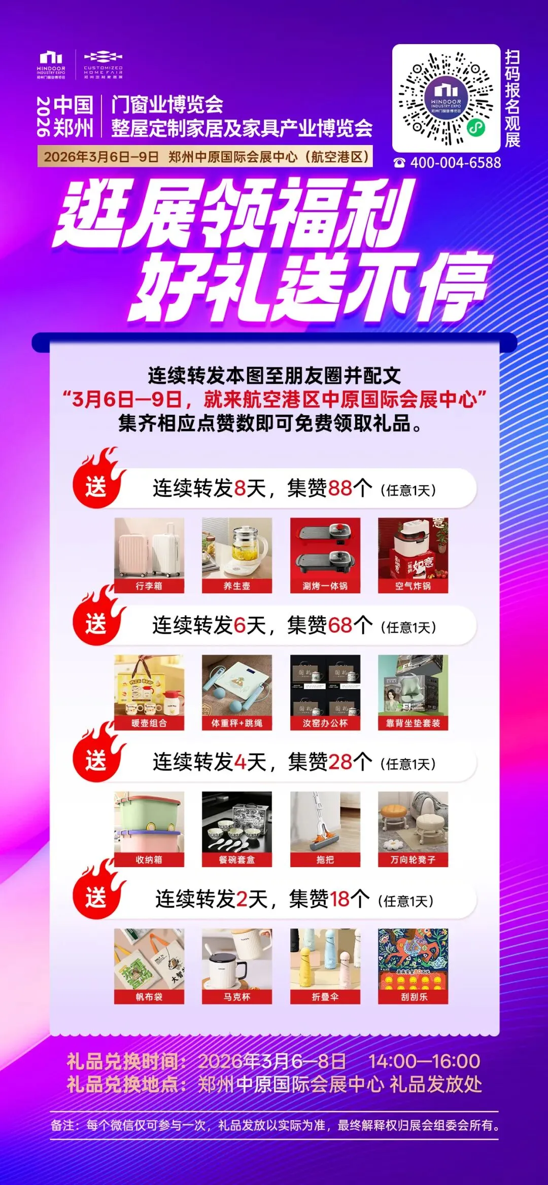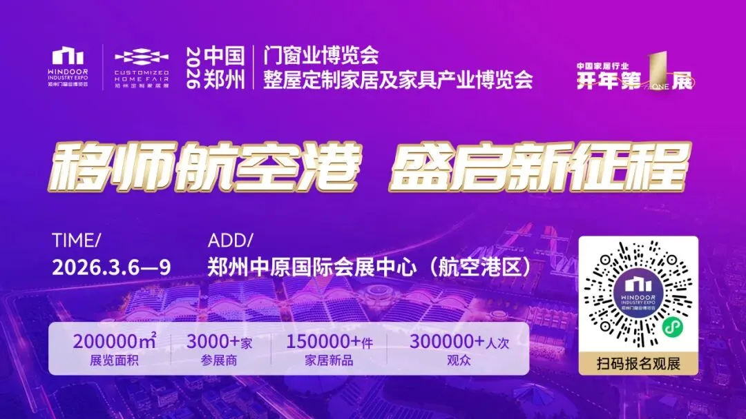2026年3月6-9日,郑州中原国际会展中心(航空港区),郑州门窗业暨整屋定制家居展盛大启幕!作为2026中国家居行业开年第一展,实力拉满: