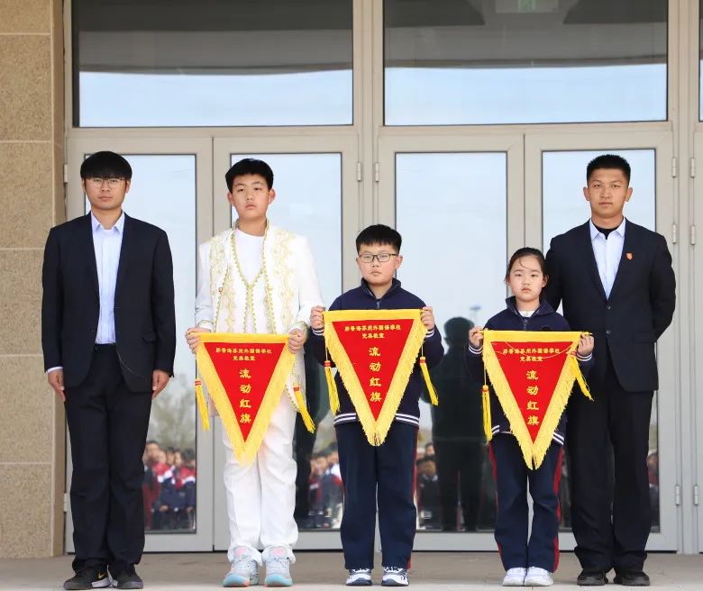 为表彰先进,鼓励优秀,学部政教处老师公布行为示范月评比结果,并为优秀集体颁发流动红旗。