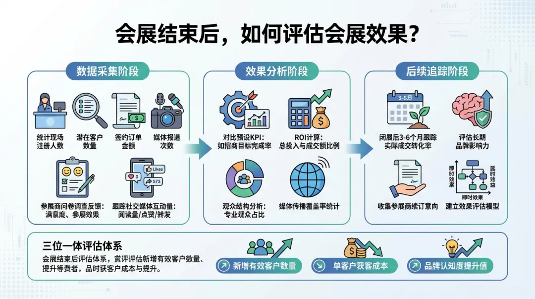 跟踪展后市场咨询量、合作咨询量、品牌搜索量的变化,对比展前数据,评估展会带来的长期品牌溢价——比如,展后咨询量提升30%,就说明展会的品牌拉动效果显著。