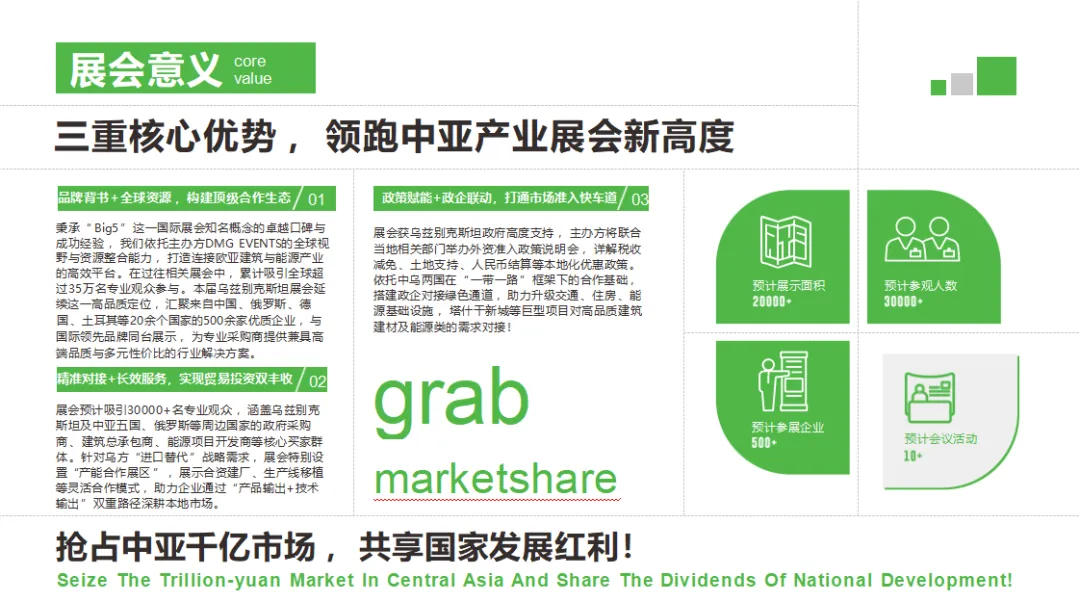 这一切,创造了每年高达数百亿美元的庞大市场需求。然而,当地供应链尚不完善,急需引入国际先进的技术、设备、材料与解决方案。作为全球建材基建与能源领域的标杆展会IP,依托DMG EVENTS全球视野与资源整合优势, 以建筑建材与绿色能源为双核心,构建连接中国企业与中亚万亿级市场的超级合作平台,诚邀您共赴这场机遇与价值并存的行业盛会。