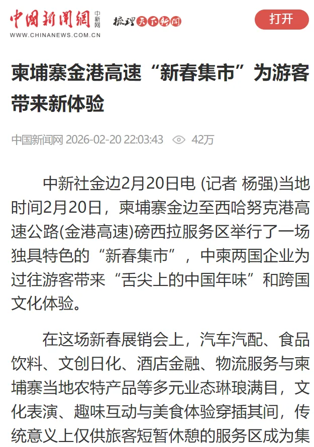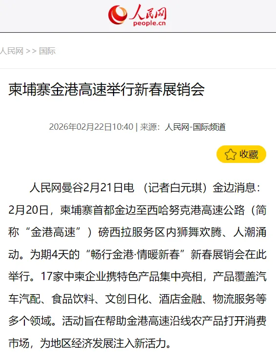 人民网《柬埔寨金港高速举行新春展销会》报道指出,活动旨在依托高速公路客流优势,帮助金港高速沿线农产品打开消费市场,为地区经济发展注入新活力。报道称柬埔寨公共工程与交通运输部副国务秘书索孔到场参观。在品尝中国美食后,他表示,展销会让柬中两国民众在“烟火气”中增进了解。金港高速不仅助力柬埔寨进入“高速公路时代”,更成为连接两国民众的“民心之路”。