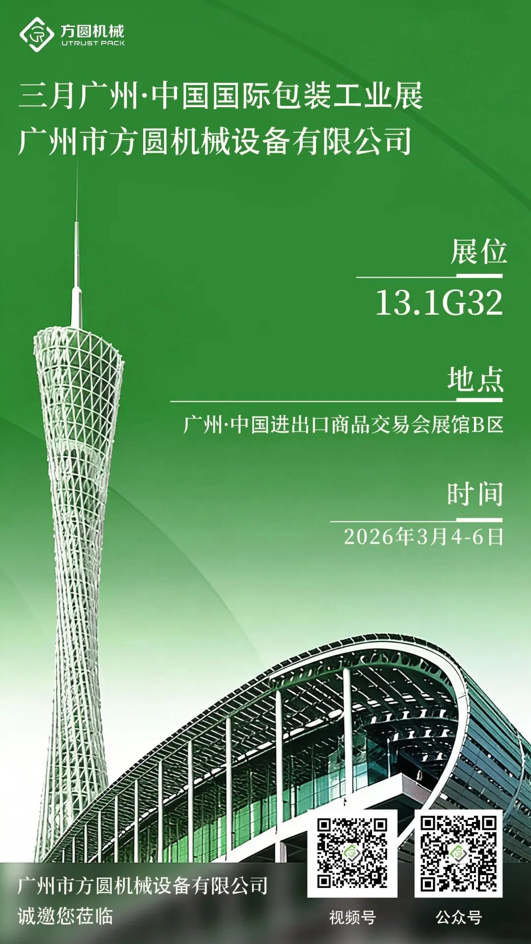 2026 年 3 月 4-6 日,中国国际包装工业展将在广州・中国进出口商品交易会展馆 B 区盛大启幕。广州市方圆机械设备有限公司,诚邀您莅临现场,共探包装工业新趋势,共话合作新可能。