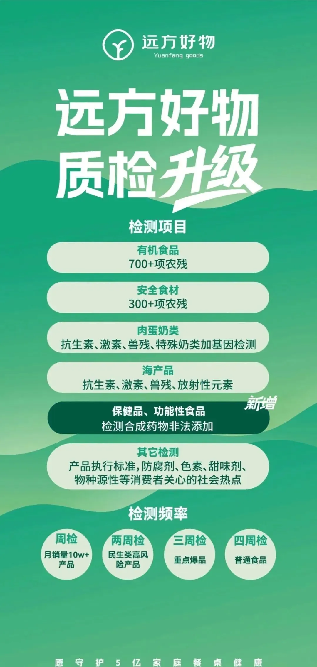 全链路检测:从新疆牧场到东北林场,2000+SKU产品全部经过SGS检测,农残、兽残等128项指标远超国标九大类目2000多款产品