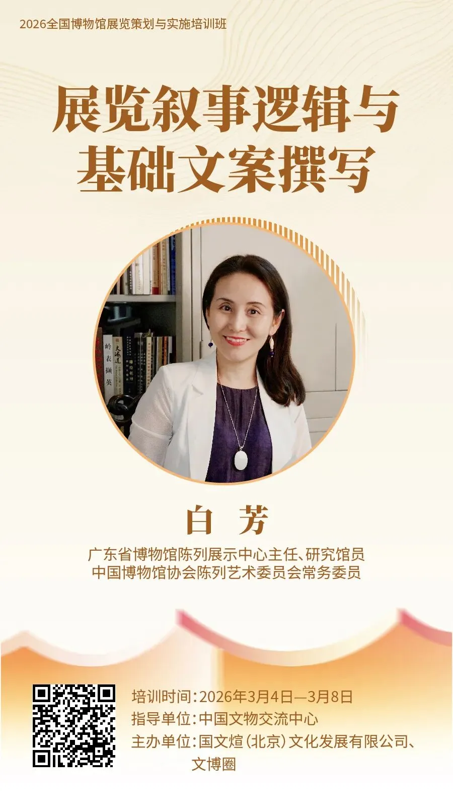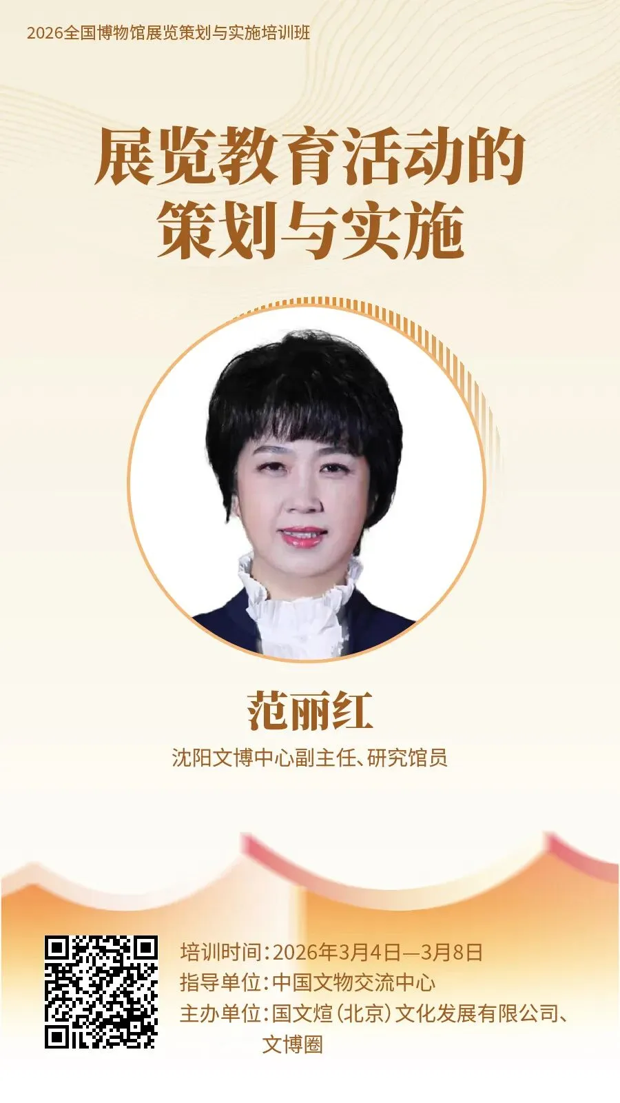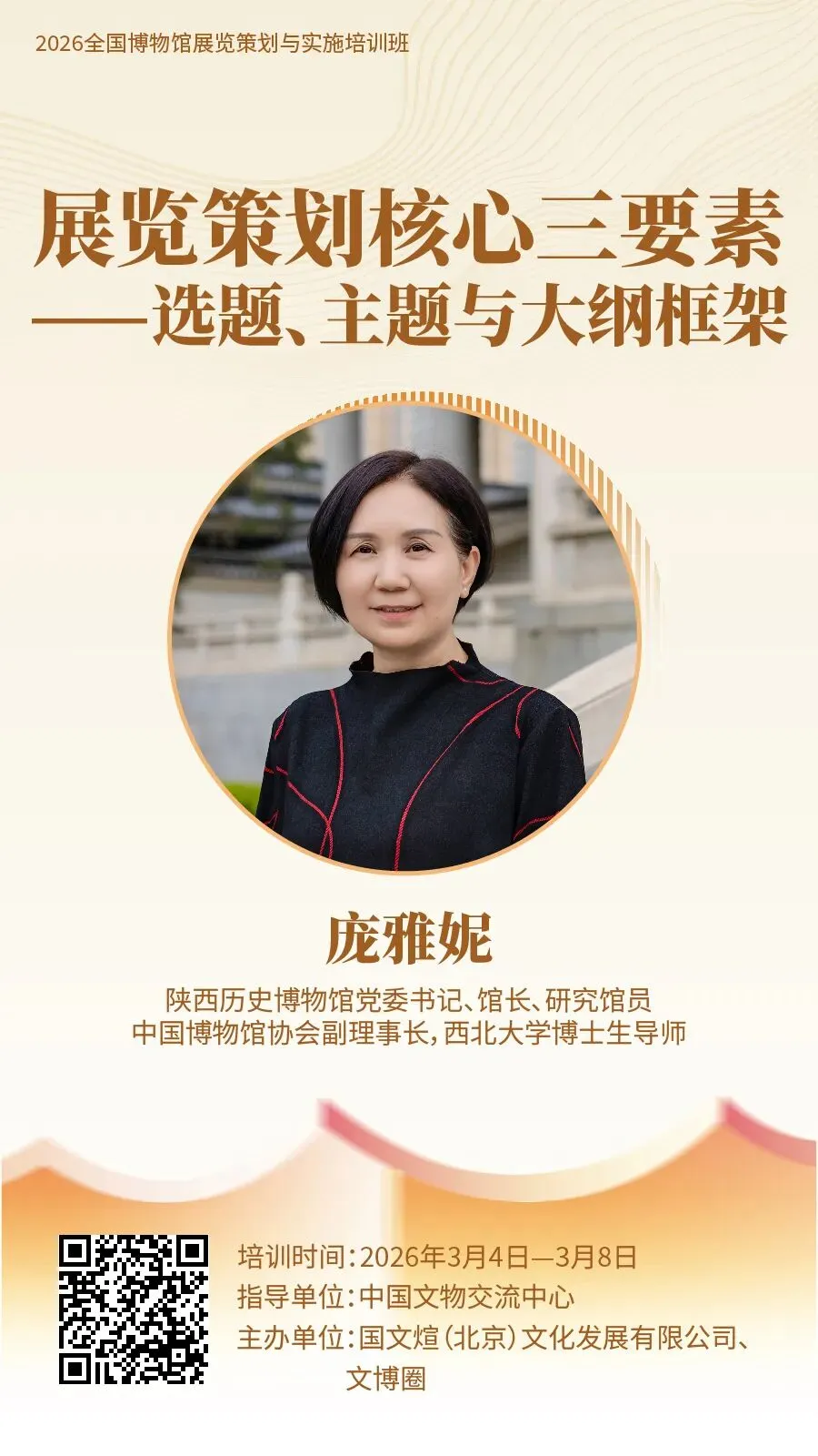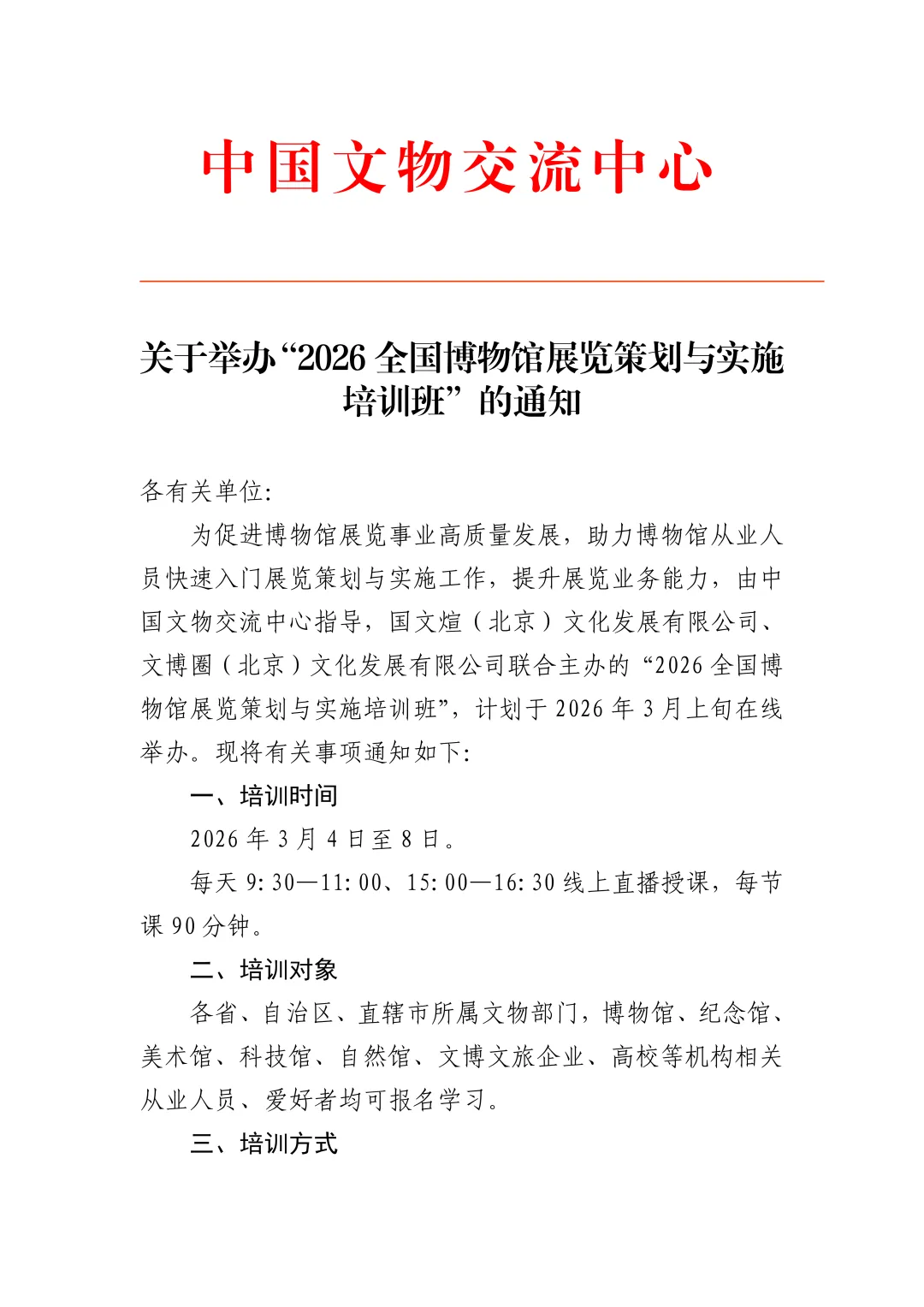 为促进博物馆展览事业高质量发展,助力博物馆从业人员快速入门展览策划与实施工作,提升展览业务能力,由中国文物交流中心指导,国文煊(北京)文化发展有限公司、文博圈联合主办的“2026 全国博物馆展览策划与实施培训班”,计划于 2026 年 3 月上旬在线举办。现将有关事项通知如下:每天 9:30—11:00、15:00—16:30 线上直播授课,每节课 90 分钟。全国各省、自治区、直辖市所属文旅、文物部门,博物馆、纪念馆、美术馆、科技馆、自然馆、文博文旅企业、高校等机构相关工作从业者、爱好者均可报名学习。