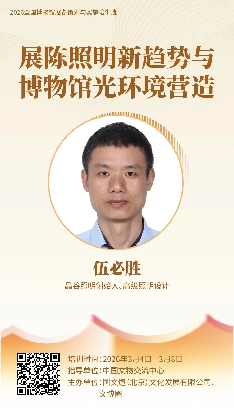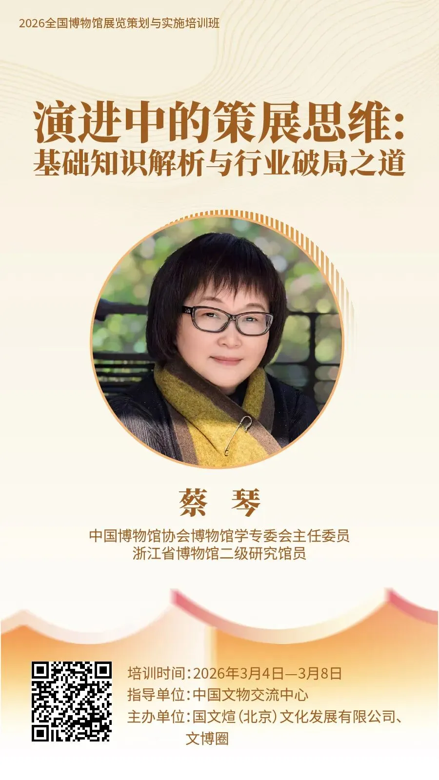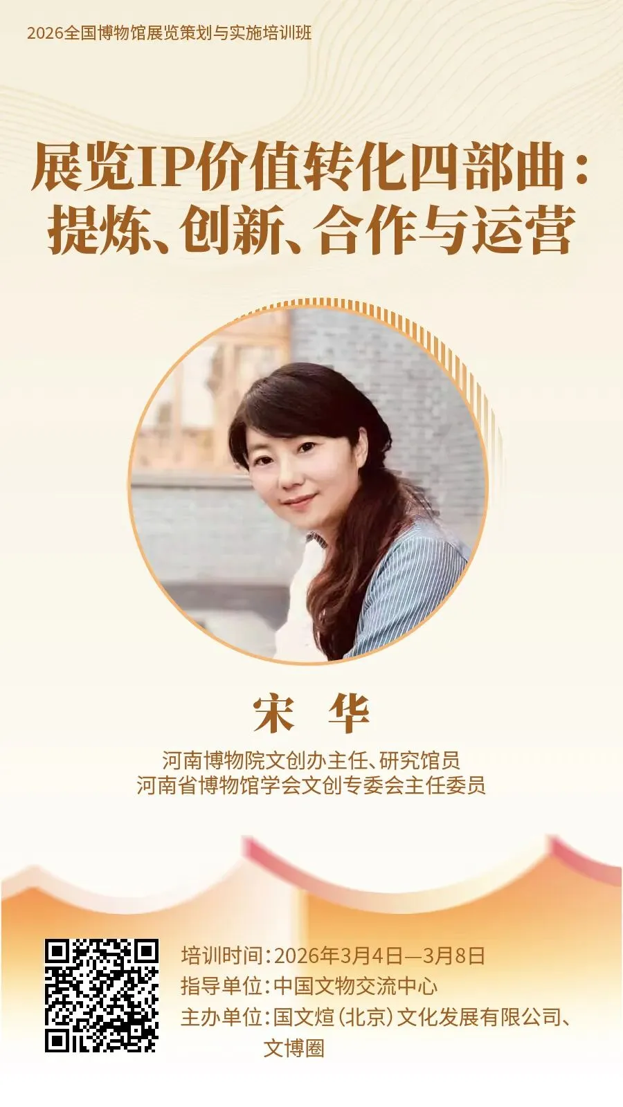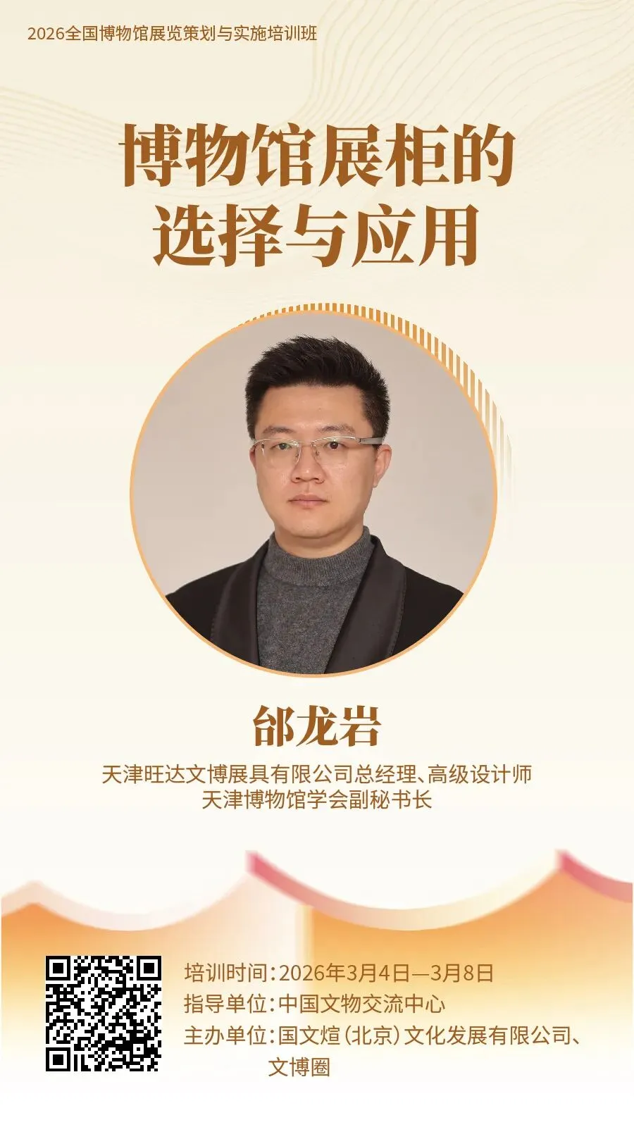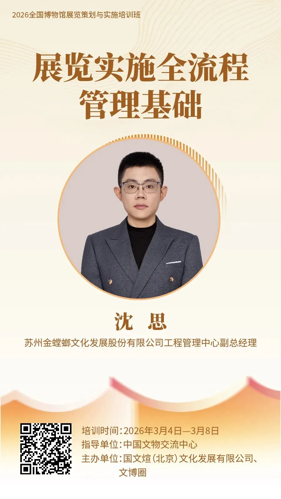 为促进博物馆展览事业高质量发展,助力博物馆从业人员快速入门展览策划与实施工作,提升展览业务能力,由中国文物交流中心指导,国文煊(北京)文化发展有限公司、文博圈联合主办的“2026 全国博物馆展览策划与实施培训班”,计划于 2026 年 3 月上旬在线举办。现将有关事项通知如下:每天 9:30—11:00、15:00—16:30 线上直播授课,每节课 90 分钟。全国各省、自治区、直辖市所属文旅、文物部门,博物馆、纪念馆、美术馆、科技馆、自然馆、文博文旅企业、高校等机构相关工作从业者、爱好者均可报名学习。