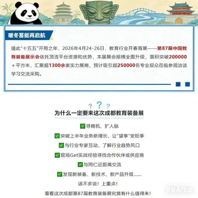 教育装备新机遇,成都盛会共启航!第 87 届中国教育装备展展位预定火热进行中,诚邀您锁定黄金展位,与行业精英同台竞技,共享教育装备高质量发展万亿市场!