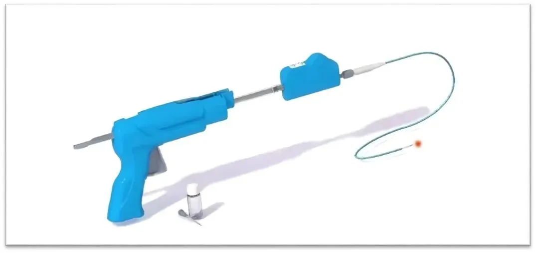 玄宇医疗自研的VariSeal®静脉闭合系统是静脉曲张治疗的创新疗法,由粘合剂和输送系统组成。其中,粘合剂通过阴离子聚合机制,在接触到人体内的阴离子时由液体变为固体,实现对血管的粘接;输送系统则由分配枪和注胶导管组成,通过导丝和长鞘配合建立起注胶路径,粘合剂在注胶导管和红光的共同指引下注入靶血管位置。