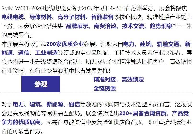 借力SMM金属平台400万注册用户资源,展商可精准触达电力集团物料采购总监、新能源车企供应链经理、通信基建物料负责人等核心决策人,让产品直接面向有真实采购需求的高意向客群;