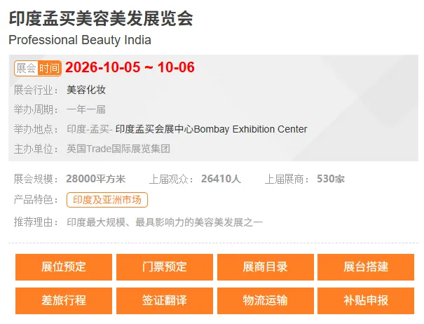 [展位预定、门票预定、展商目录、展台搭建、差旅行程、签证、翻译、物流运输、补贴申报]