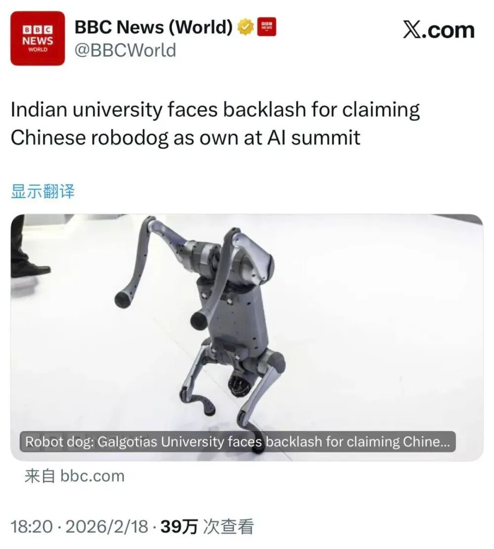 作为主办方的印度,竟然在这样一个国际级别的峰会上,明目张胆地拿中国和韩国的产品,当做自己研发的科技成果。2月17日,这场峰会开幕式的当天,印度加尔戈蒂亚斯大学的教授辛格,在接受印度国家电视台采访时,对着镜头向全世界人民展示了他们大学最新的科研成果——一款名为Orion的机器狗。这个视频被发到电视台的官媒上后被迅速传播,甚至就连印度信息技术部的部长都亲自转发。结果有网友发现,这个所谓的印度大学自研的机器狗,竟然和中国宇树科技Go2机器狗一模一样,严格来说,这就是宇树科技的Go2。这个消息一出,舆论瞬间沸腾了,那个信息技术部的部长,也紧急删除了转发的帖子。加尔戈蒂亚斯大学方面也是做出了回应,表示他们从未声称这个机器狗是自己研发的,而是采购来给学生们研究学习用的。但是显然,大家对这个理由很不感冒,毕竟,你们自己人都说这是你们研发的。还是对着电视台的采访,这个教授说他们学校研发了一个AI足球无人机。对着摄像机,辛格老师言之凿凿,竟然说这个足球无人机从头到尾、从上到下,全部是他们学校自主研发、印度首创。结果紧接着又被网友扒出,这个无人机是韩国一家公司的产品。校方都麻了,赶紧再次出来“狡辩”,说这个无人机和机器狗一样,都是校方统一采购的产品。拿采购的产品来参展算怎么回事儿呢?如果要是网友没发现,是不是就打算继续冒名顶替?估计也是被网友喷的太狠了,校方这次拿出了大杀器,一个正儿八经、完完全全自研的无人机,绝对不是买的别人的。中国小学生的手工作业也比这个精致啊,实在不行从义乌买个仿品也算那么回事。估计也是让这个学校把脸丢尽了,峰会的主办方憋不住了,非常客气的要求这个大学自己退出展会。主办方急眼了,直接断电,让保安将校方的参展团队“请”了出去。这么抓马的事儿都能发生,会让人觉得这个峰会一定不是什么正经峰会。这场峰会由印度电子和信息技术部牵头主办,地点选在了新德里的Bharat Mandapam。要知道,这里同时也是去年二十国集团峰会的主会场,这场AI峰会的规格有多高,从会场的选址就能看出来。谷歌的皮查伊来了,OpenAI的奥尔特曼来了,Anthropic的达里奥·阿莫迪来了,微软的总裁、亚马逊的高管都来了。甚至连联合国的秘书长古特雷斯也出现在了会场,印度总理莫迪更是在峰会上发表了演讲。但是从现场的反馈来看,这场峰会的表现,却和印度方面的预期相去甚远。从媒体角度来看,印度的媒体几乎把这场峰会吹上了天,认为这是印度AI崛起的起点,是整个印度实现大国梦的契机。但是从线下参展商和与会观众的角度来看,这就是一场彻头彻尾的国家级闹剧。多了不说,光说这个排队,就让无数参展商和观众头疼不已。本身进入会场就要进行严格的安检和审核,这个无可厚非,毕竟是高级别的会议,安检严格一点也能理解。但是主办方的准备显然是不足的,不少人足足排了好几个小时的队才进入会场,本以为进入会场就万事大吉了。结果每当有一个政要到来,现场都要强制清场,然后等政要走了,再重新安检排队几小时进场,不止是观众,参展商也是这个待遇。不仅如此,主办方还要求参展商把产品和设备留在场内,信誓旦旦地表示会提供强有力的安保措施。结果一个初创团队的产品就在众目睽睽下被人偷了,最后是报警才把东西找回来的。一个国家主办的一场峰会,参展商最重要的展品被偷了,多少有点一言难尽了。印度电子和信息技术部长在记者会上宣布:印度收到的承诺投资总额超过2700亿美元。这些钱的投资商包括谷歌、微软、OpenAI等等硅谷大厂。首先就是老生常谈的电力问题,就连美国现在都因为电力设施老化,而影响了AI的进一步发展。印度这种基础设施落后的国家更不用说了,没有充足的电力供应就谈发展AI,纯粹就是纸上谈兵。此外,印度的自身实力也不足,在高端芯片制造领域,印度几乎是一片空白,而且印度虽然有一些实力强悍的AI工程师,但是却支付不起合理的费用,导致大量的人才流入美国。印度的研发支出占GDP的比重仅仅只有0.7%以下,作为对比,中国是2.5%,美国是3.5%。不仅如此,这些研发支出中,绝大部分是军事研发的支出,AI这种民用研发的支出少得可怜,没钱还想发展高端AI?纯属做梦!印度的这场“闹剧”真就应了那句话:“无人扶我凌云志,我让自己成笑话。” 《AI Summit 2026: AP CM Naidu to attend, state to sign 7 key MoUs》3. 观察者网 《印度一大学买宇树科技机器狗冒充自研,光速露馅》4. 看看新闻 《印度一大学展出泡沫塑料无人机 被赶出AI峰会》5. 凤凰资讯 《雄心勃勃办AI峰会,第一天就差评如潮…印度致歉》