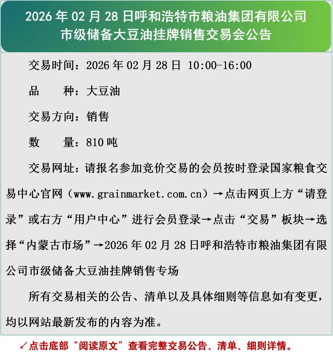 2026年02月28日呼和浩特市粮油集团有限公司市级储备大豆油挂牌销售交易会公告