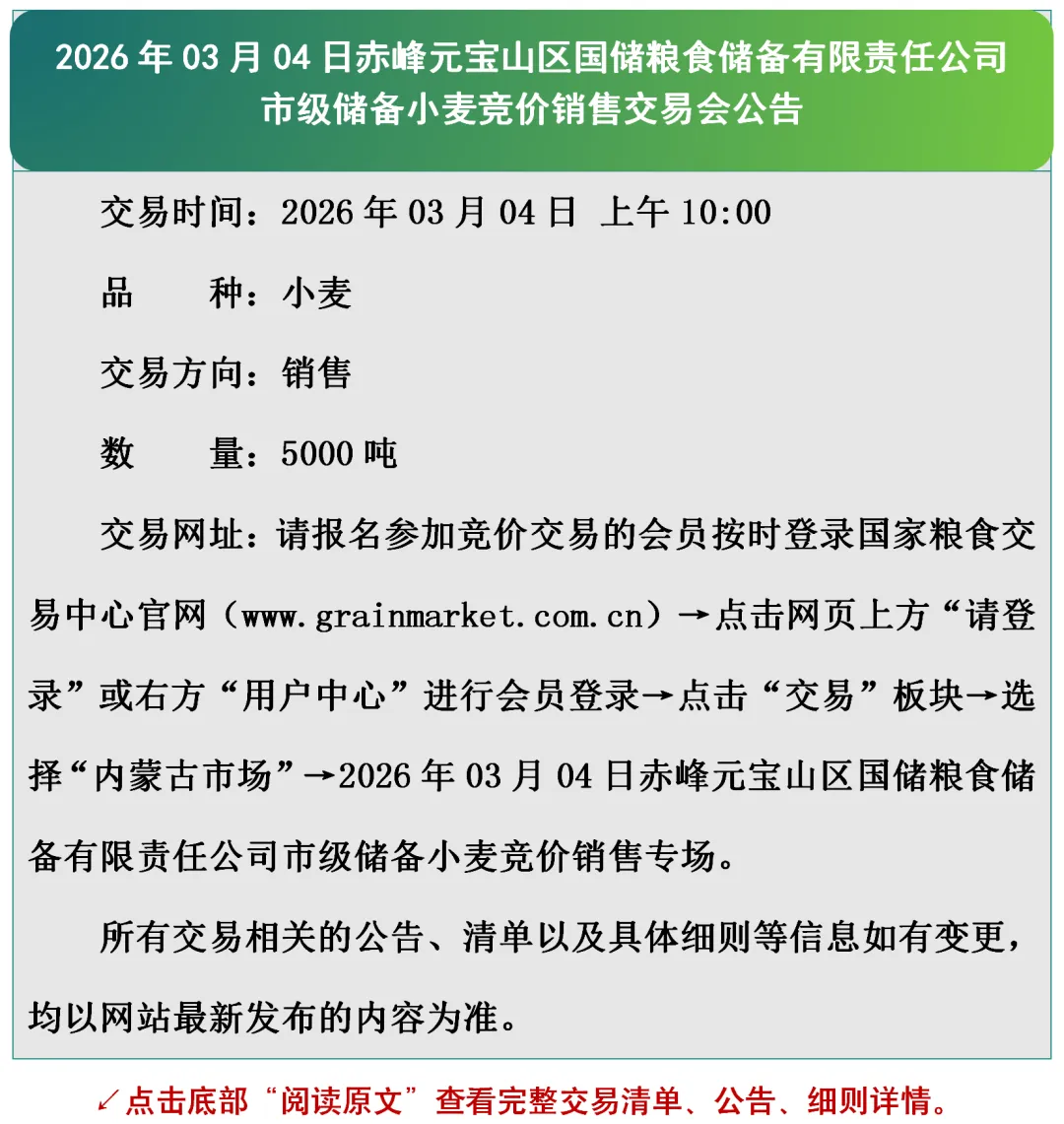 2026年03月04日赤峰元宝山区国储粮食储备有限责任公司市级储备小麦竞价销售交易会公告