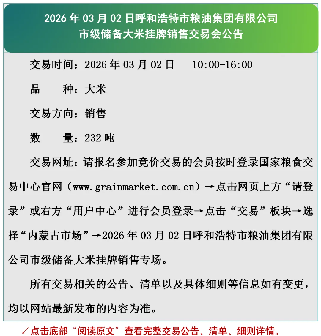 2026年03月02日呼和浩特市粮油集团有限公司市级储备大米挂牌销售公告