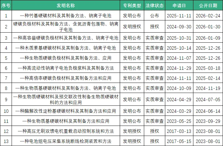 针对竹基硬碳材料产业化难题,公司突破五大核心技术与全流程一体化生产工艺,实现低成本高性能竹基硬碳材料的1000吨级规模化生产,推动了钠离子电池商业化进程;公司拥有国家发明专利20余项,涵盖全链条专利布局,形成自主知识产权和技术优势。部分钠电专利如下: