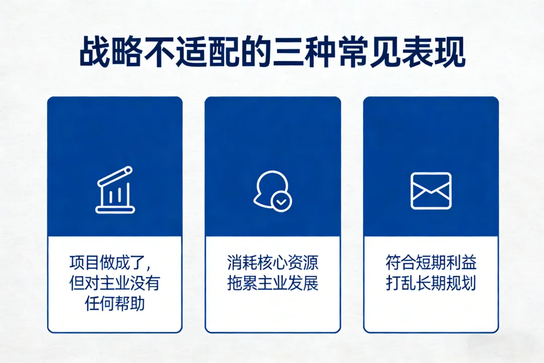 战略不适配,说白了就是“项目和公司的核心业务、长期方向不搭”;最要命的是,当我们面对一个新项目时,往往只关注它的“赚钱机会”,而忽略它对公司战略上带来的负面影响。以我的经历和对会展行业的观察来看,这种现象相当普遍,我重点说三种表现: