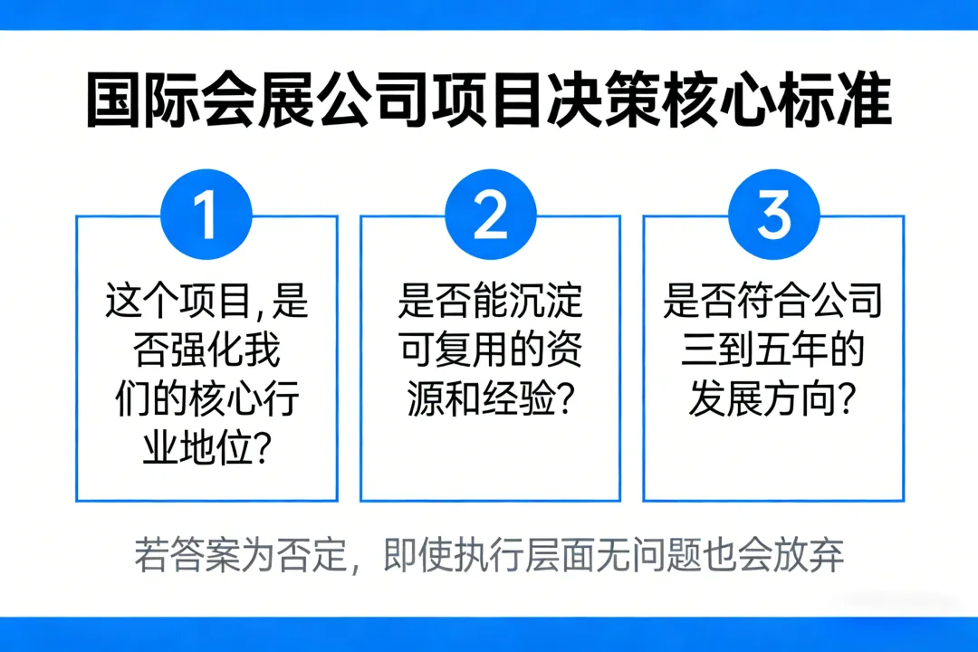 在国际会展公司的内部决策中,“能不能做”只是基本门槛,真正决定一个项目去留的,是下面三个问题: