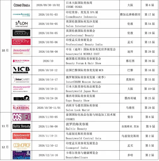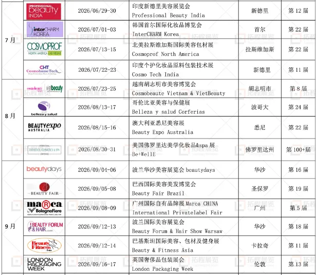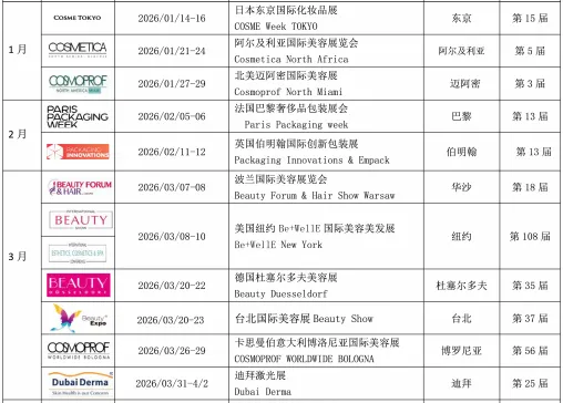 结合对各区域市场节奏及行业趋势的持续观察,拓程展览 2026 年全球美容展会计划表已出。该计划覆盖亚洲、欧洲、美洲、非洲及中东等核心市场,涵盖美妆成品、个护、包装包材、美容仪器、SPA 健康等多个领域,为企业提前规划海外参展提供参考。