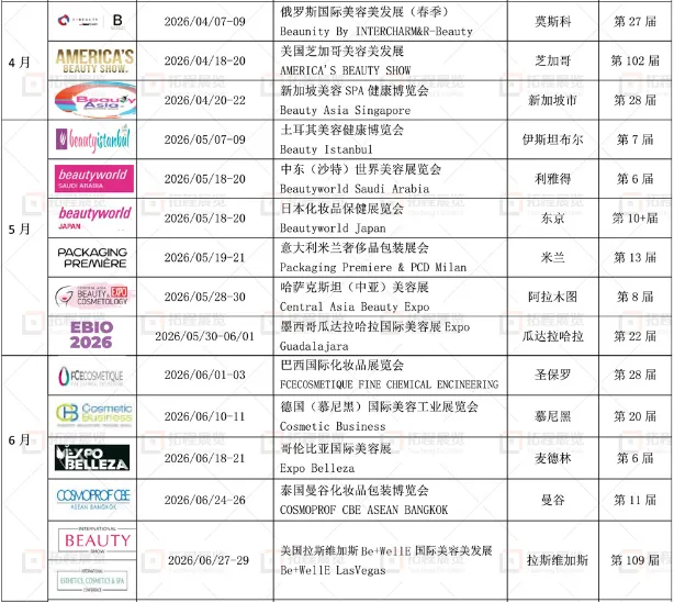 夏季展会在包材、原料、自有品牌及区域市场方面表现活跃,东南亚、南美及大洋洲相关展会密集。国内与海外展会同期展开,为企业提供更多组合参展与市场对比的可能性。