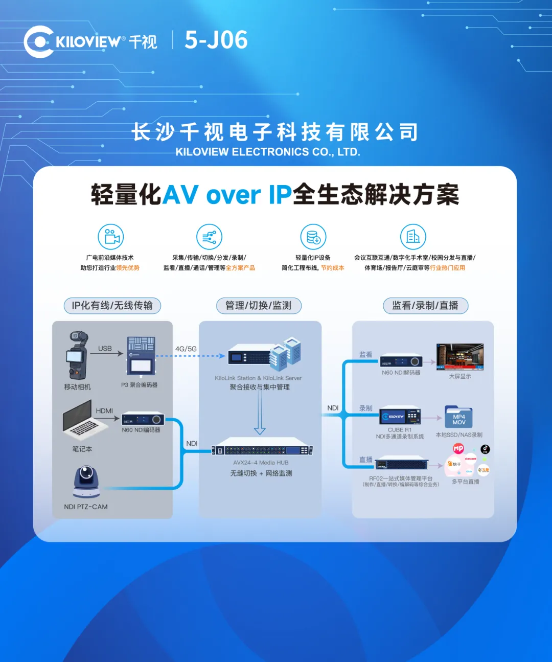 展会现场,您将亲身体验到业界首创的可视、可控、可信的IP网络管理平台——AVX24-4 Media HUB,更可实际探索支持高达8台千视P系列聚合的一站式无线聚合接收与设备管控平台——KiloLink Station,助您节省投入成本的同时,更让您真正体会到前所未有的极简且强大的网络与设备管理体验。
