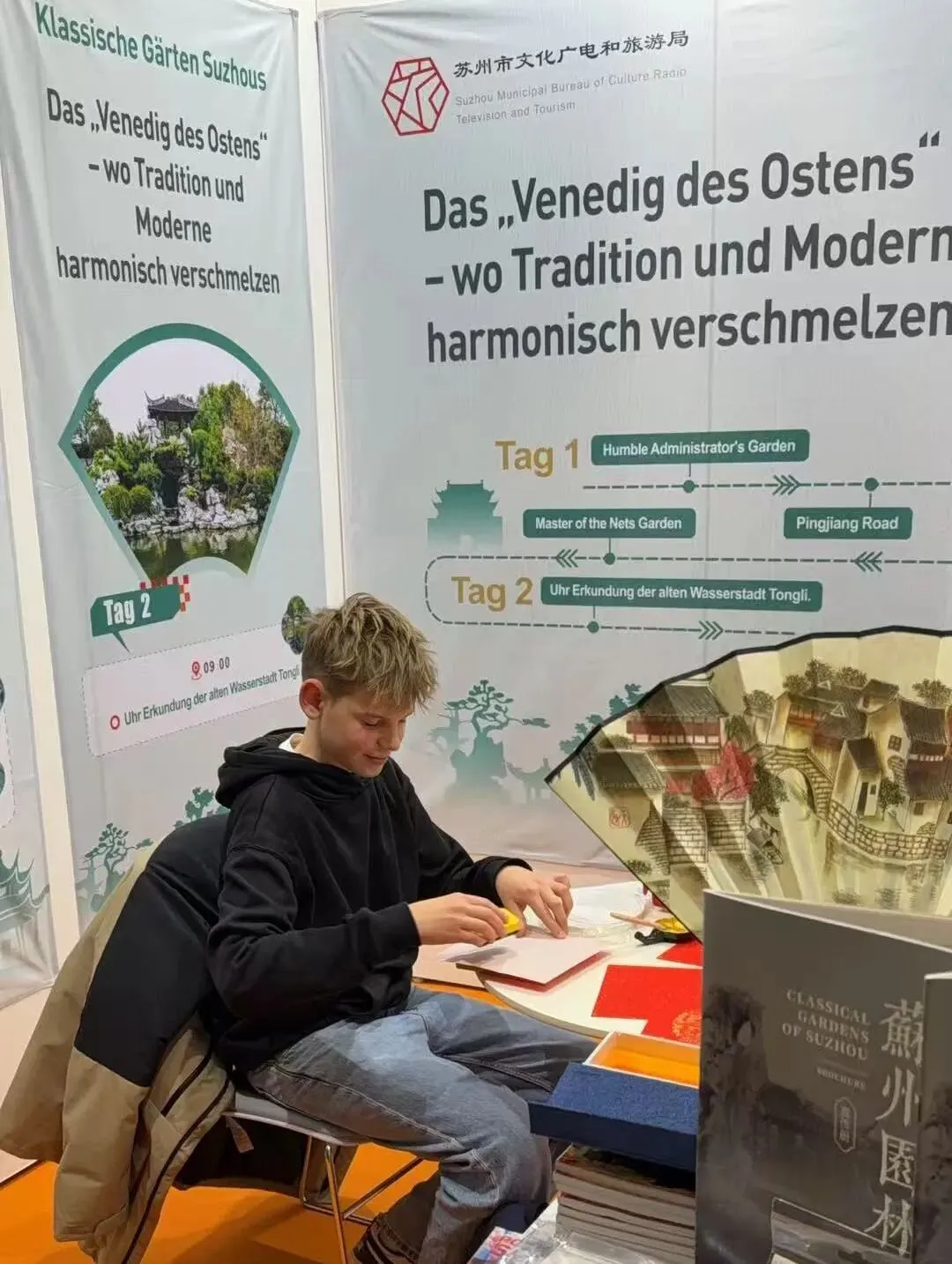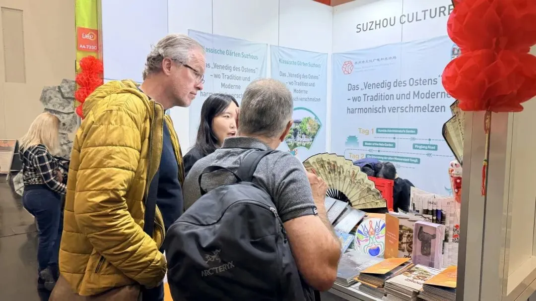 苏州展位还通过文创展示和互动体验,生动呈现苏州传统工艺与当代文旅创新成果,吸引大量观众驻足咨询。观众饶有兴趣地参加现场木刻年画的印制,其中有一位德国观众被苏州“东方威尼斯”的画面表述所吸引,当他听到中国对德国免签的信息,他表示将会与家人一起制定到苏州的旅游计划。