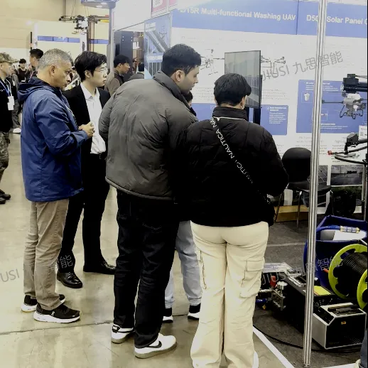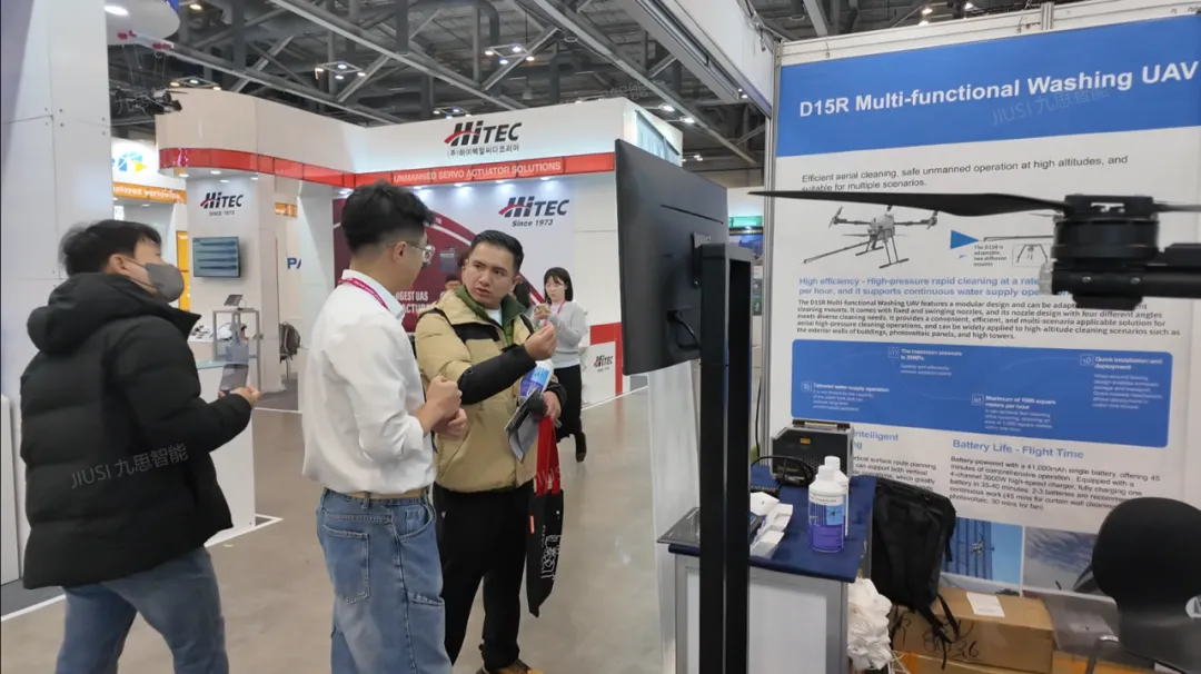 开展首日,展会现场人气爆棚,各类前沿无人机技术与创新应用轮番呈现,低空经济、智能作业等热点话题备受关注。九思智能展位前更是人头攒动、热闹非凡,成为展会现场颇具人气的展台之一。往来参观者络绎不绝,不少海外行业人士、经销商主动驻足,围着D15R多功能清洗无人机仔细询问,现场与团队深入洽谈合作细节,对方案的性能优势和应用价值表现出极高的兴趣。