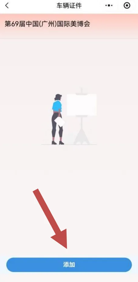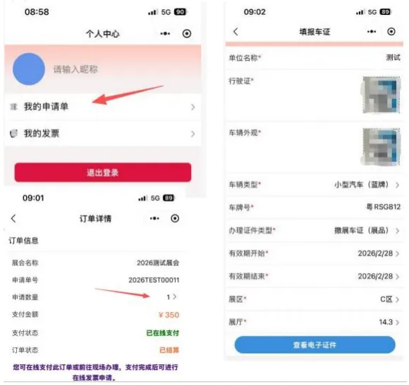 参展商客户进入"展商快速申请小程序”,点击右下角“我的”进入“我的申请单”,点击进入“订单详情” 页面在申请数量(带箭头处)进入“填报车证”页面查看或下载电子车证。