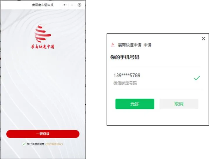 (1)点击“一键登录”,选择登录的手机号。绑定后,后台会将开票和扣减押金(如有)的短信发到该手机号,建议用参展商员工的手机号码进行绑定。